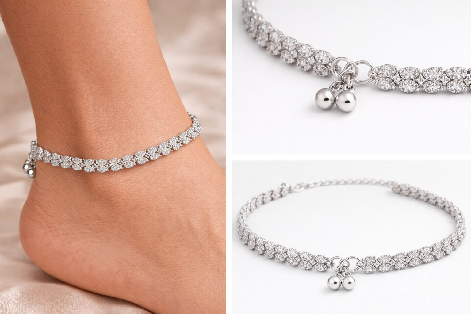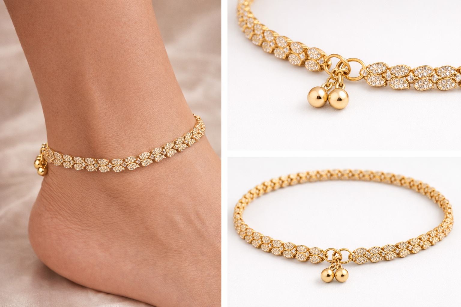 Elegant American Diamond Anklet Pair available in Gold, Silver, and Antique finishes. Perfect for weddings, bridal wear, and festive occasions. Lightweight, sparkling, and designed for a luxurious look.
