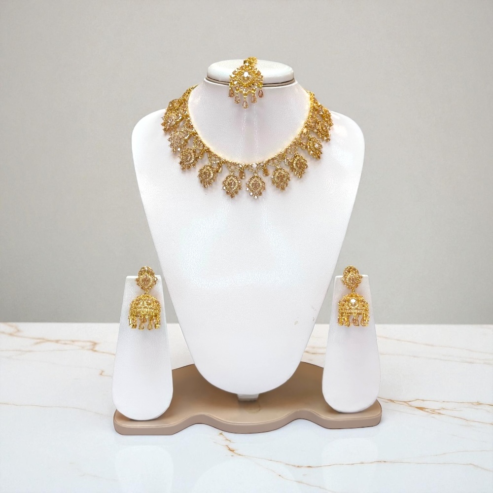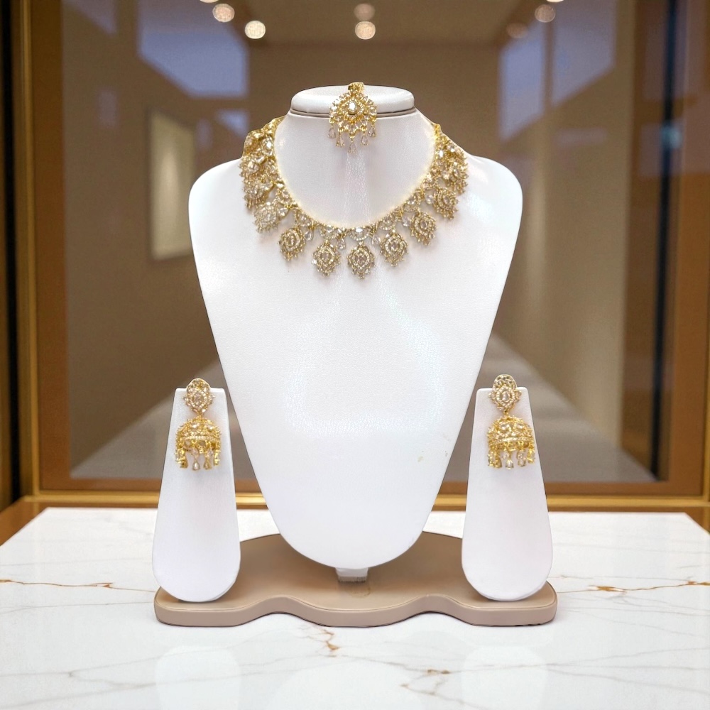 Elegant American Diamond Necklace Set with matching Jhumki earrings and Tikka, crafted on bright gold plating. Perfect for weddings, parties, and festive occasions. Add timeless beauty and sparkle to your look.
