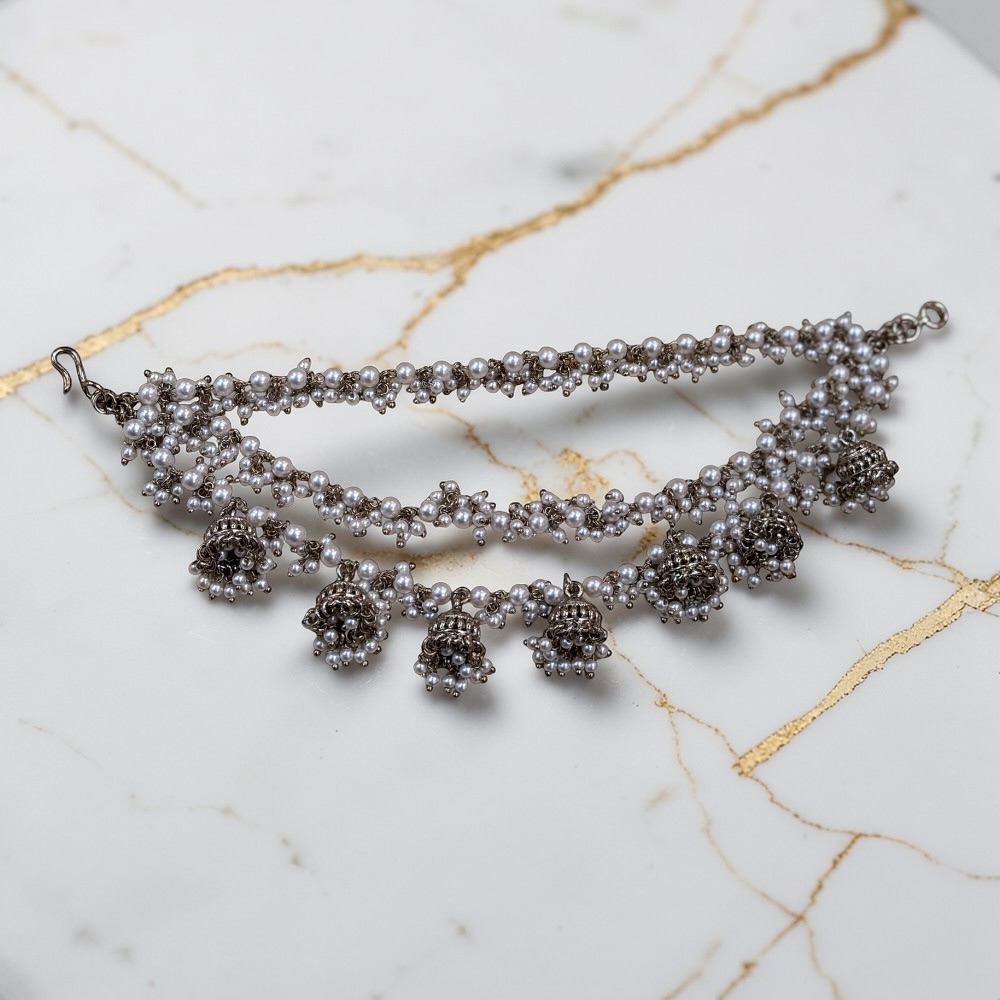 Add a timeless charm to your jewelry collection with this beautifully handcrafted Jhumki Sahara with white pearls and antique base. This traditional ear chain is specially designed to support heavy jhumki earrings while elevating your overall bridal and festive look.