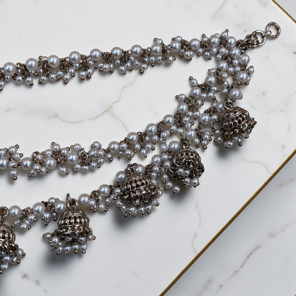 The multi-layered pearl strands combined with intricate jhumki detailing create a luxurious and elegant appearance, making it a perfect choice for South Asian weddings and cultural events.