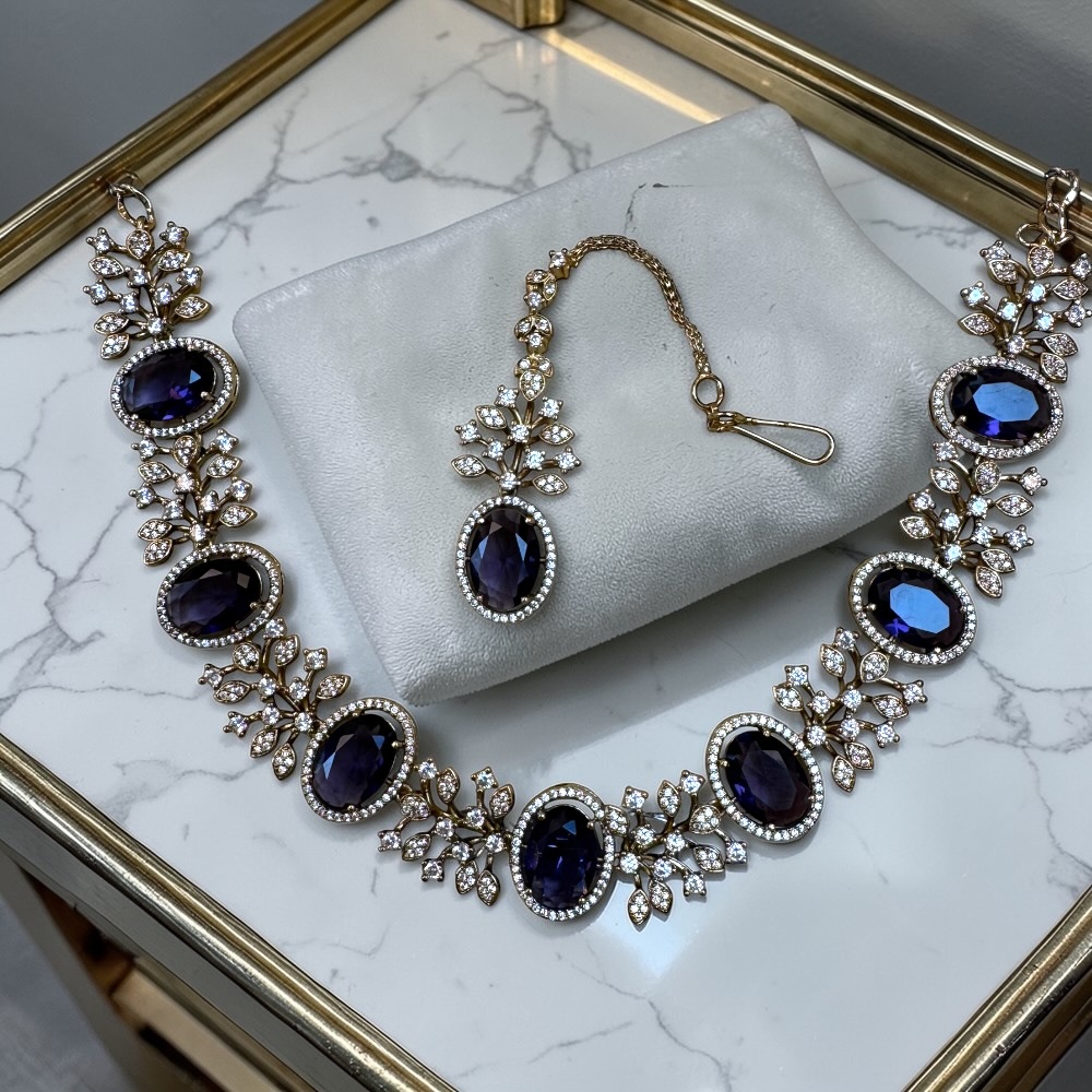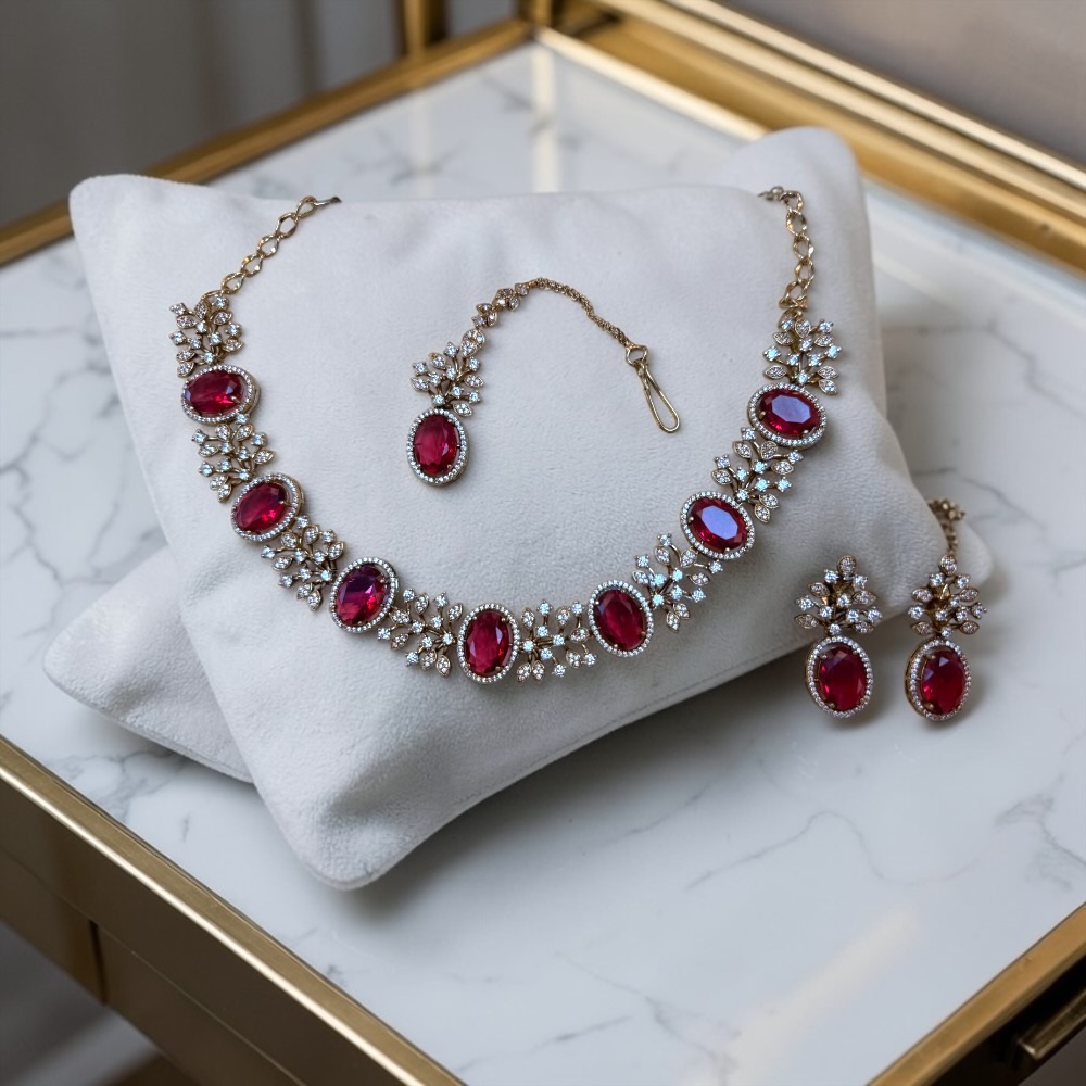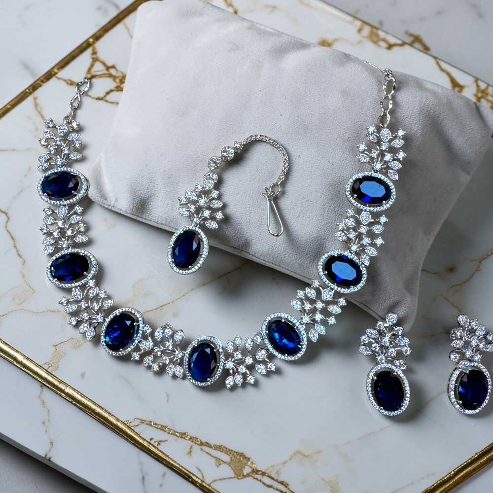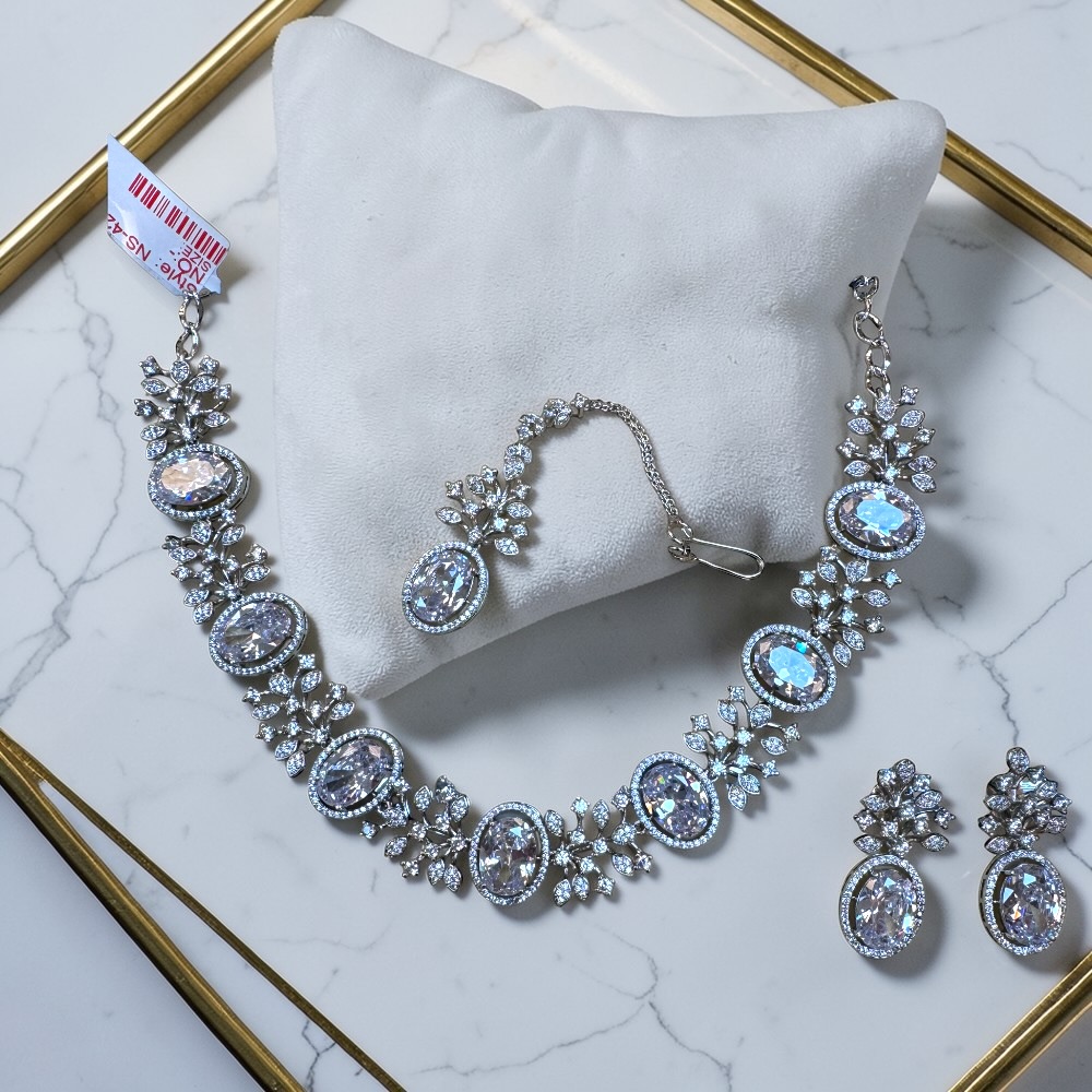 Complete your bridal or party look with this stunning American Diamond Necklace Set. Available in multiple colors and two finishes, this set is designed for elegance and luxury.