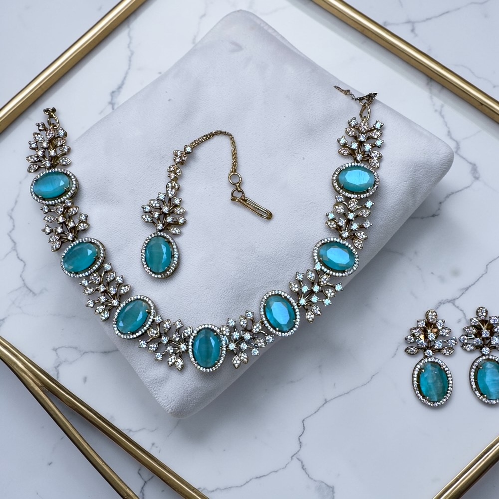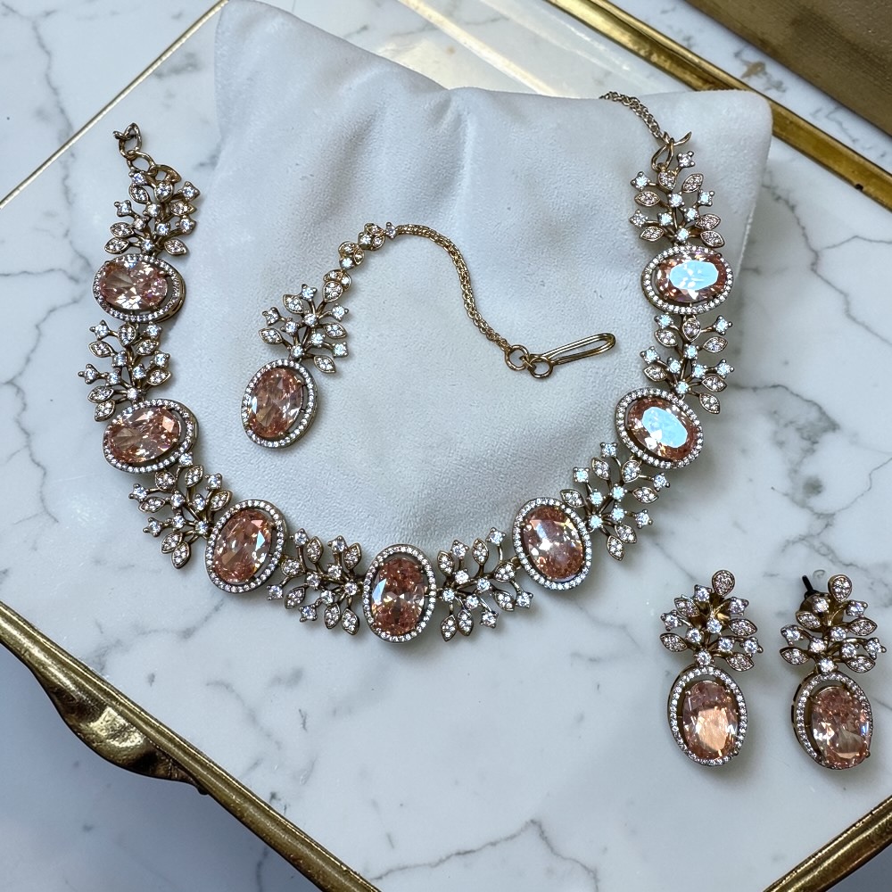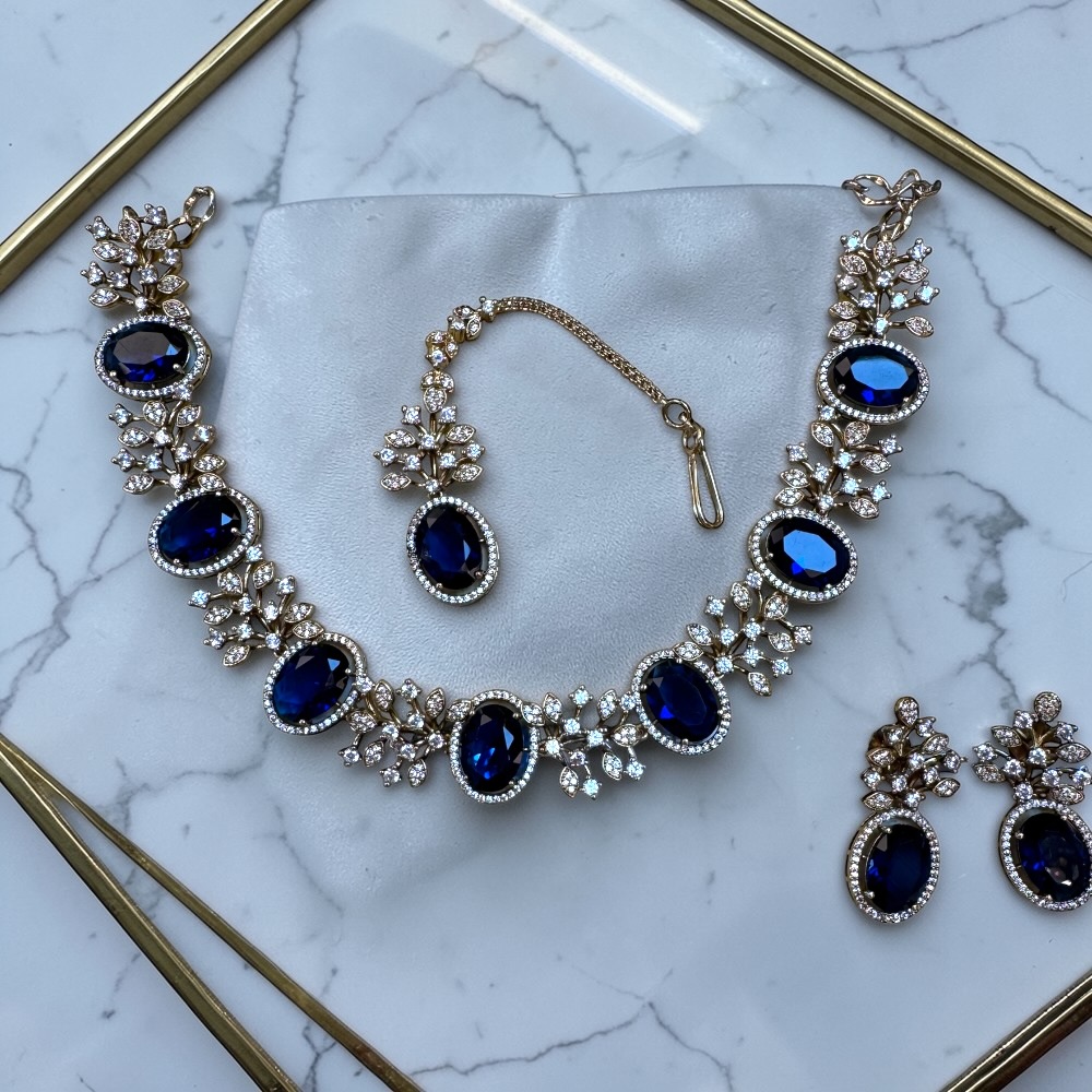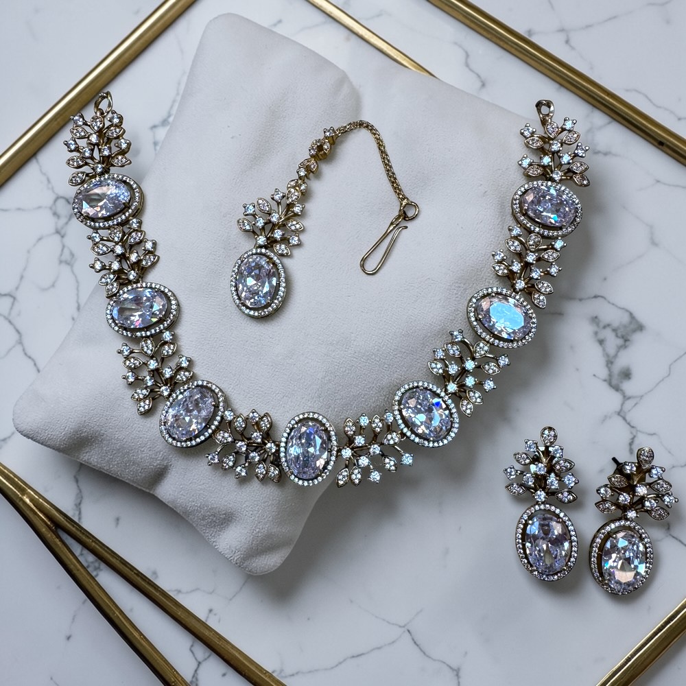 Complete your bridal or party look with this stunning American Diamond Necklace Set. Available in multiple colors and two finishes, this set is designed for elegance and luxury.