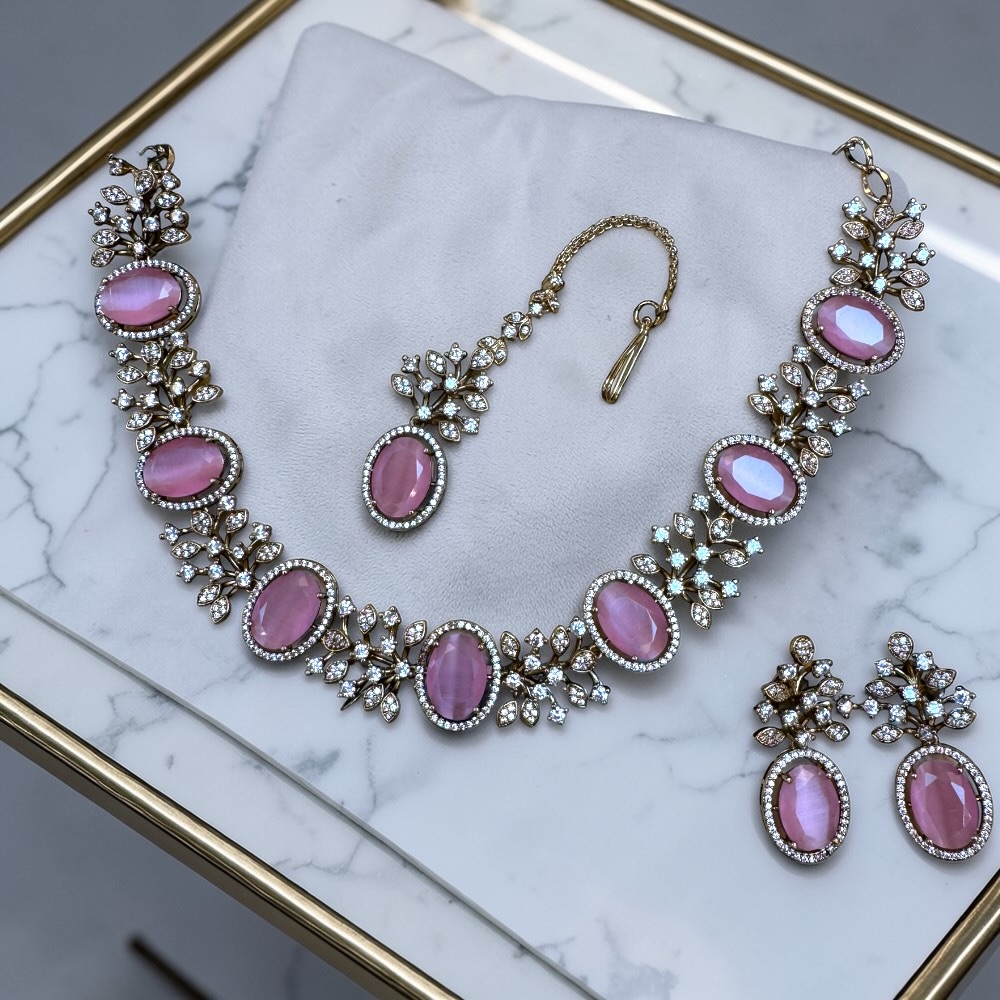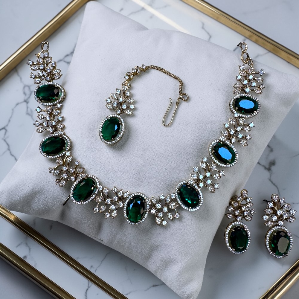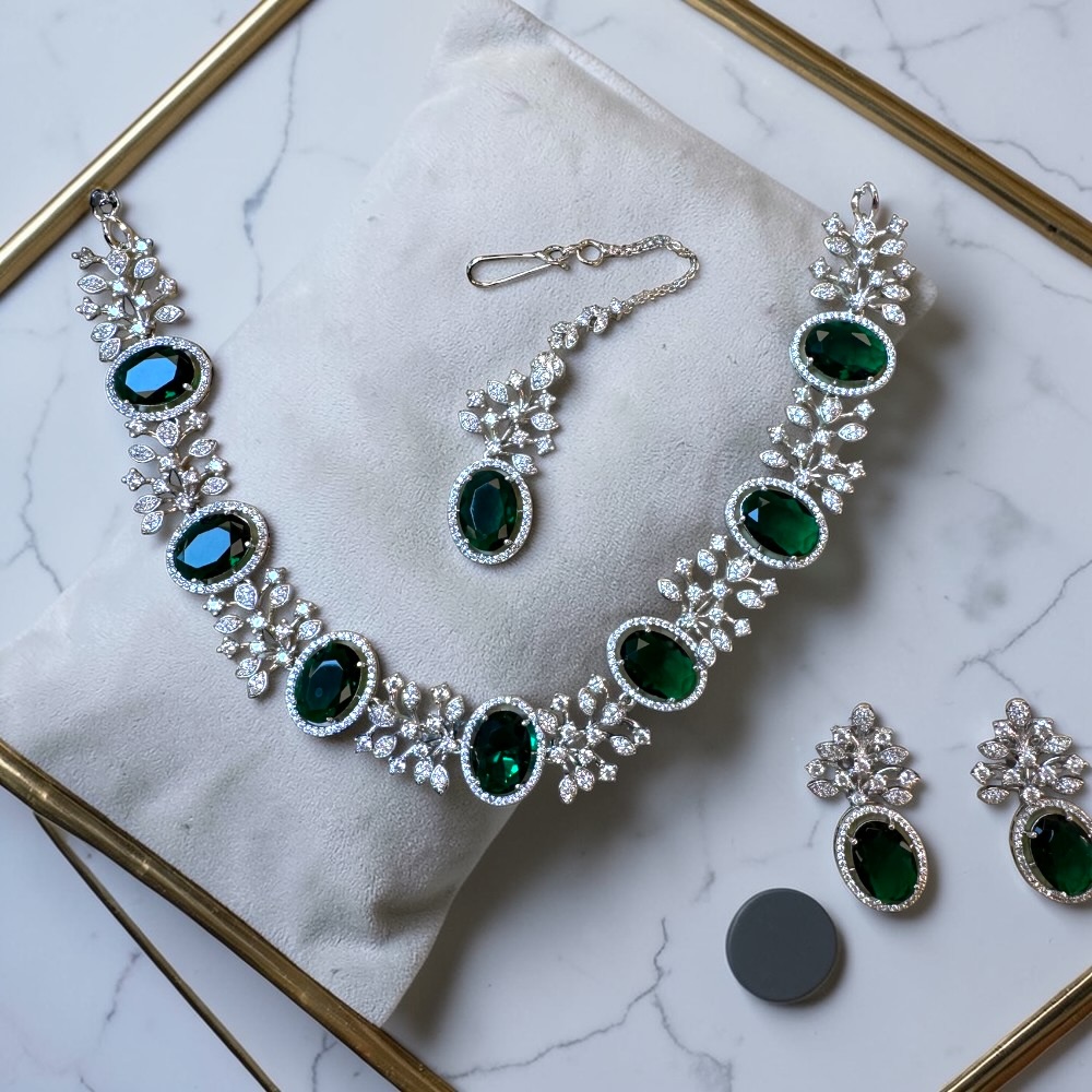 Exquisite Bridal Necklace Set including Necklace, Earrings, and Tikka in 8 colors (Maroon, Mint Green, Dark Mauve, Baby Pink, Emerald, Gold, Navy Blue, White + Silver) with Antique or Silver finish. Perfect for weddings, engagements, Nikkah, Walima, and festive occasions.