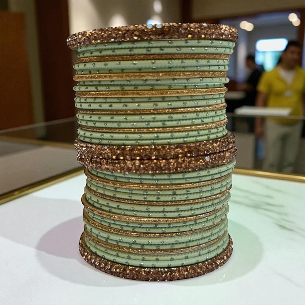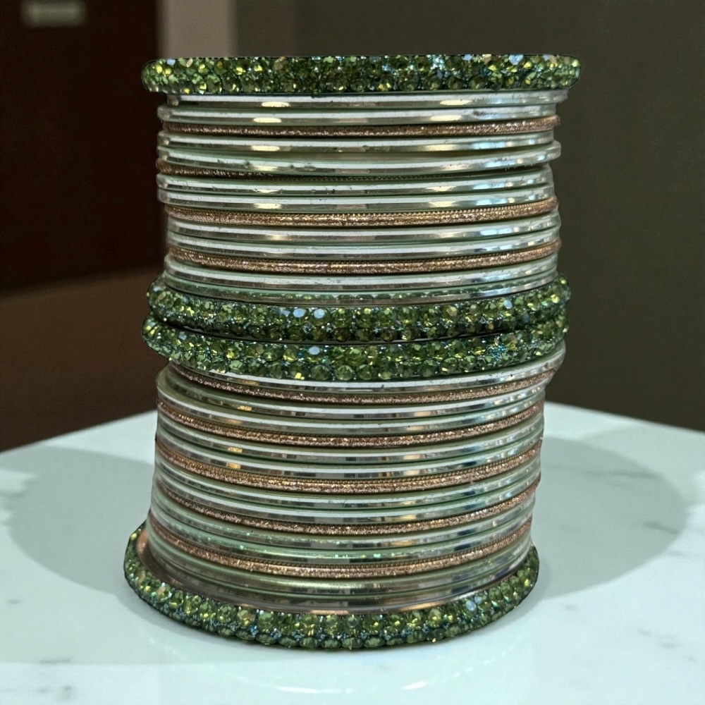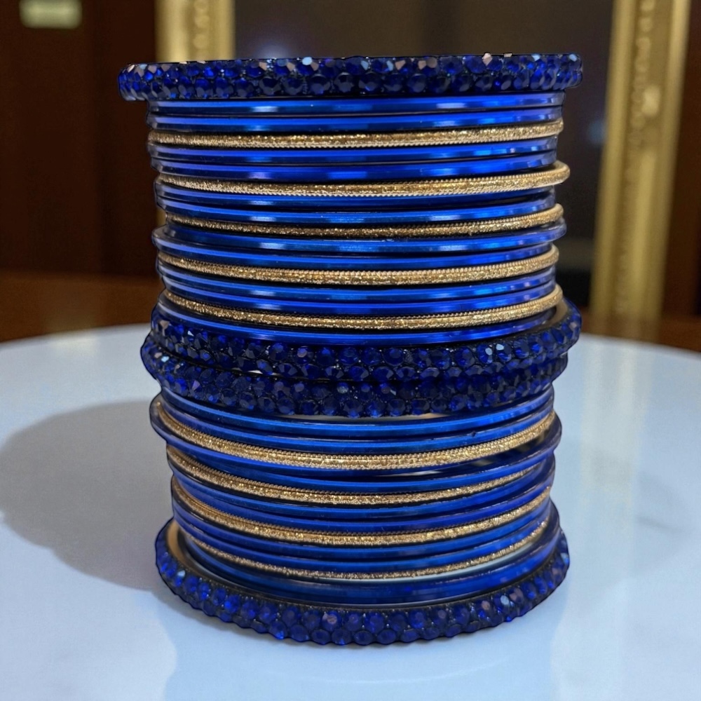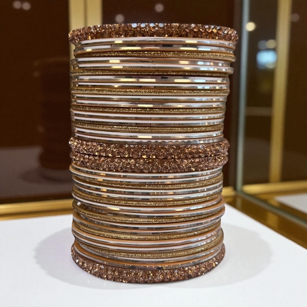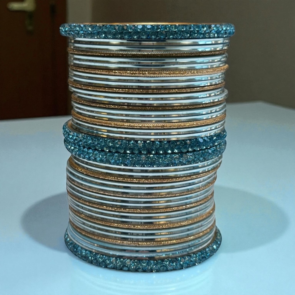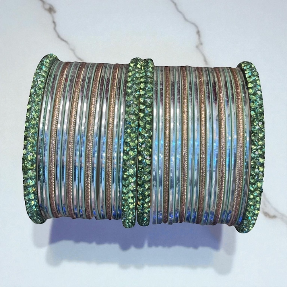 Elegant crystal bangle set featuring 4 churi bangles, 10 mixing bangles, and 24 colourful crystal bangles. Perfect for weddings, parties, or festive wear — lightweight, comfortable, and can be worn on one or both arms.