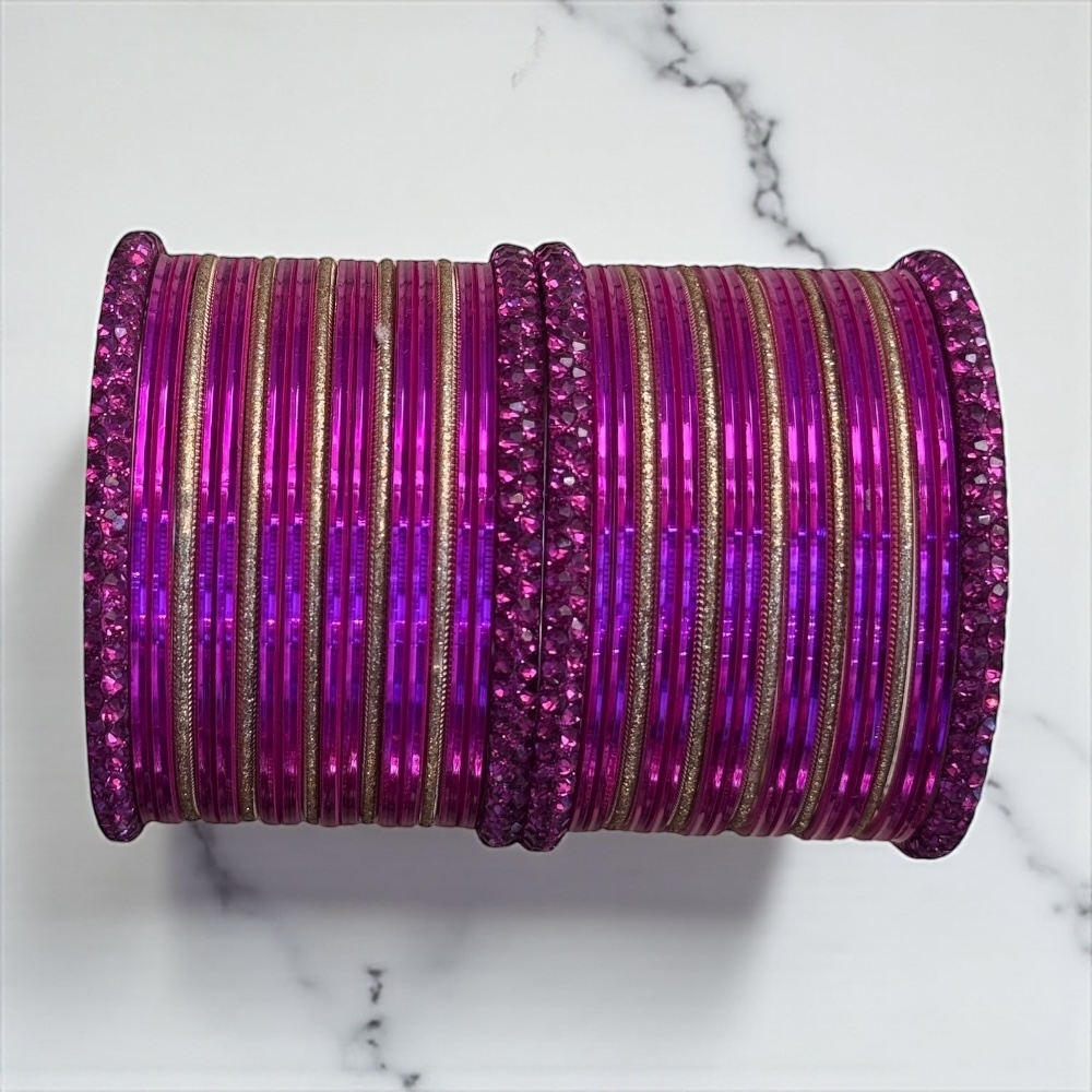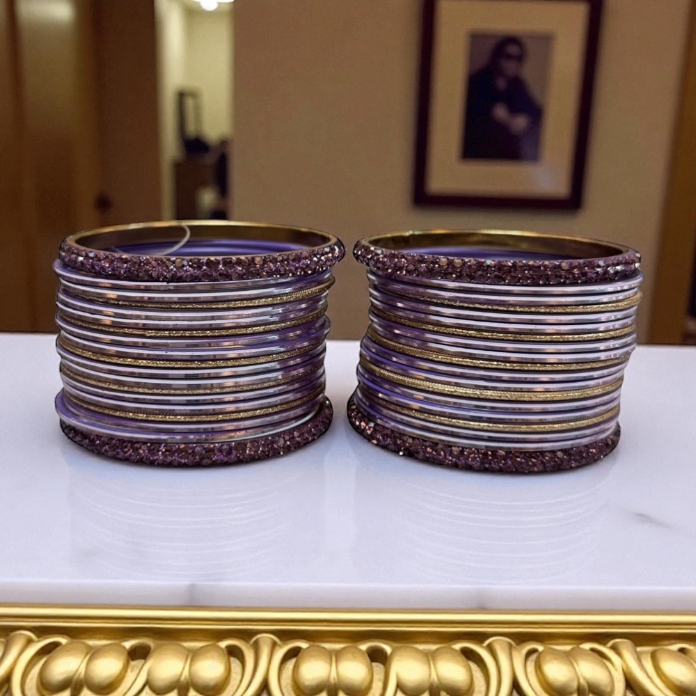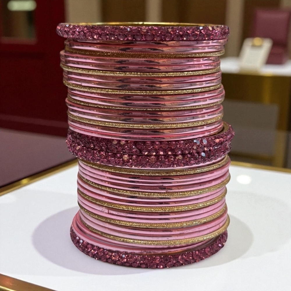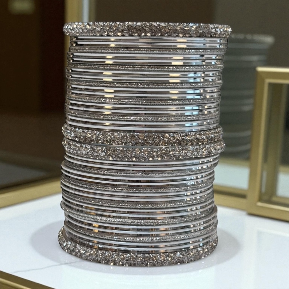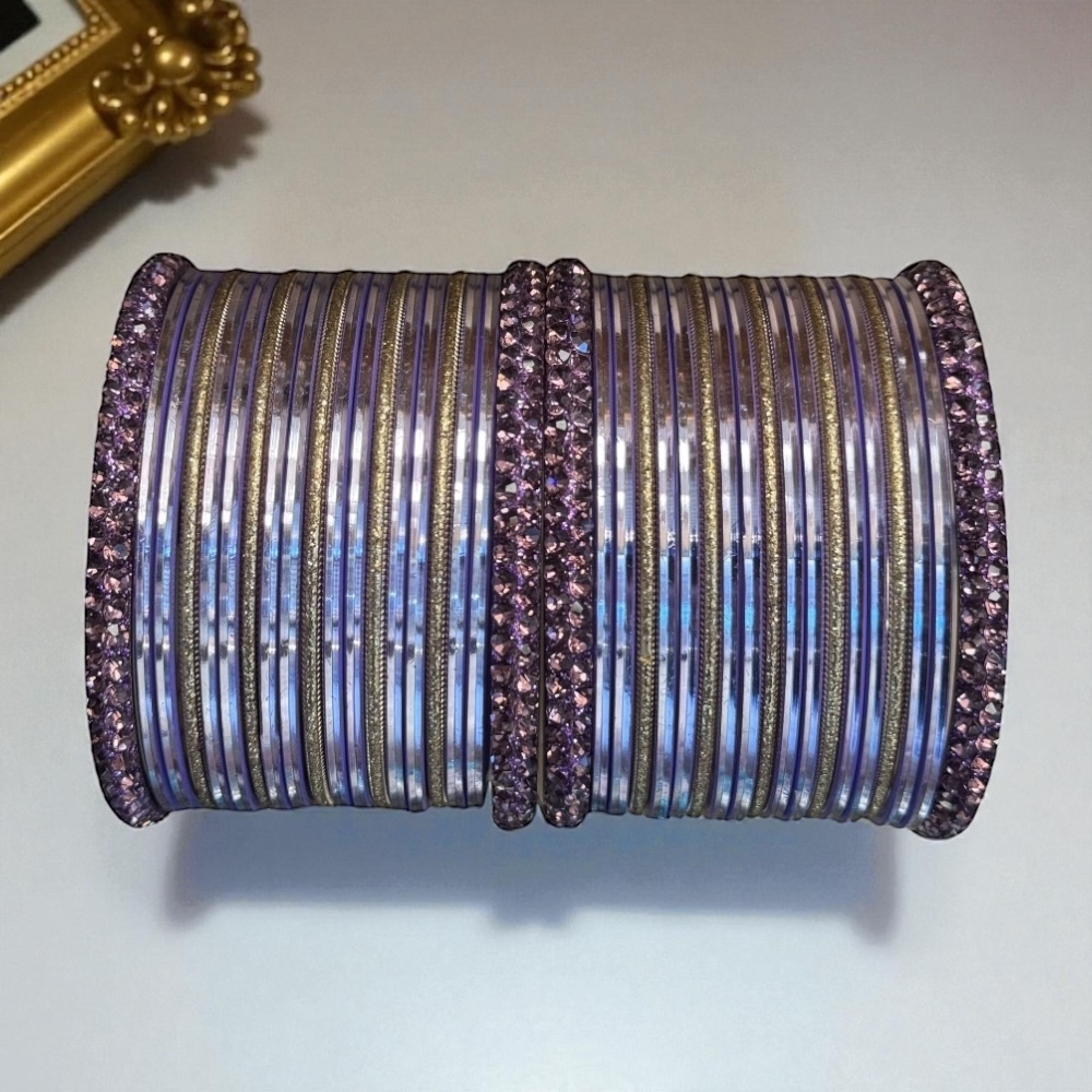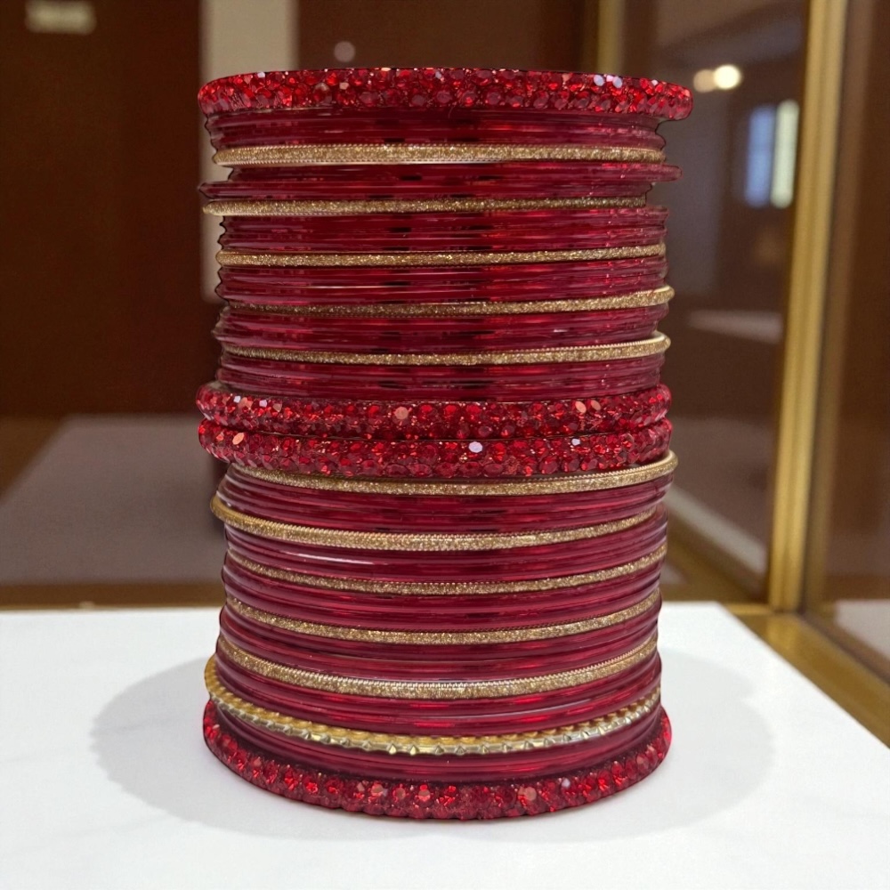 Elegant crystal bangle set featuring 4 churi bangles, 10 mixing bangles, and 24 colourful crystal bangles. Perfect for weddings, parties, or festive wear — lightweight, comfortable, and can be worn on one or both arms.
