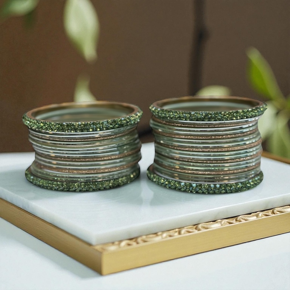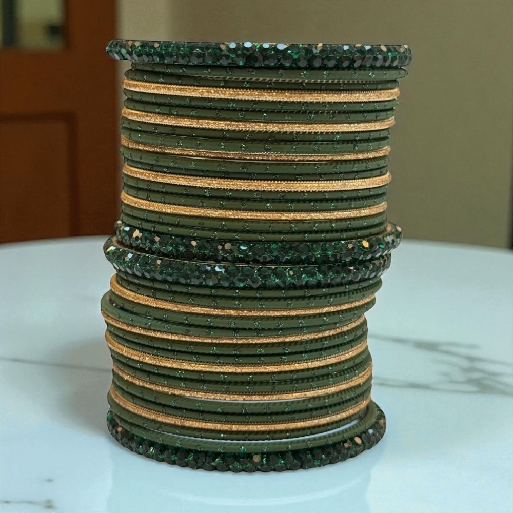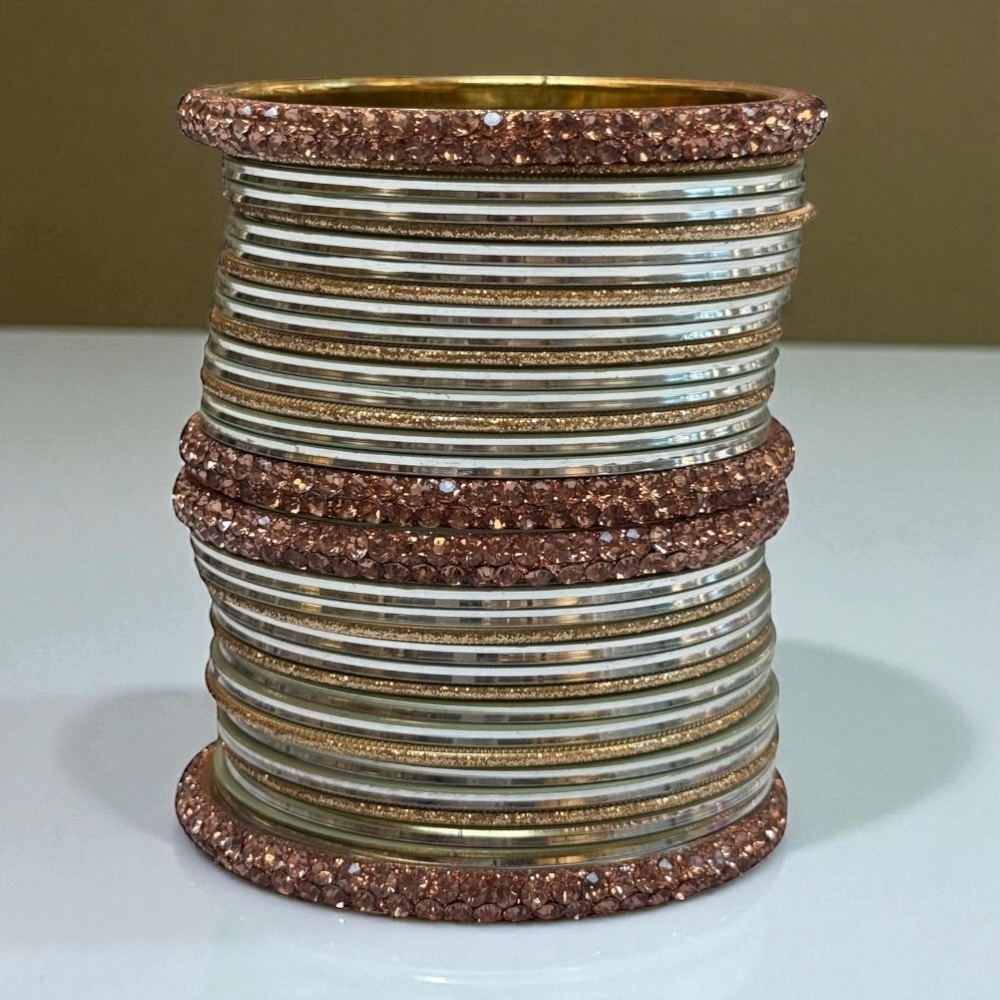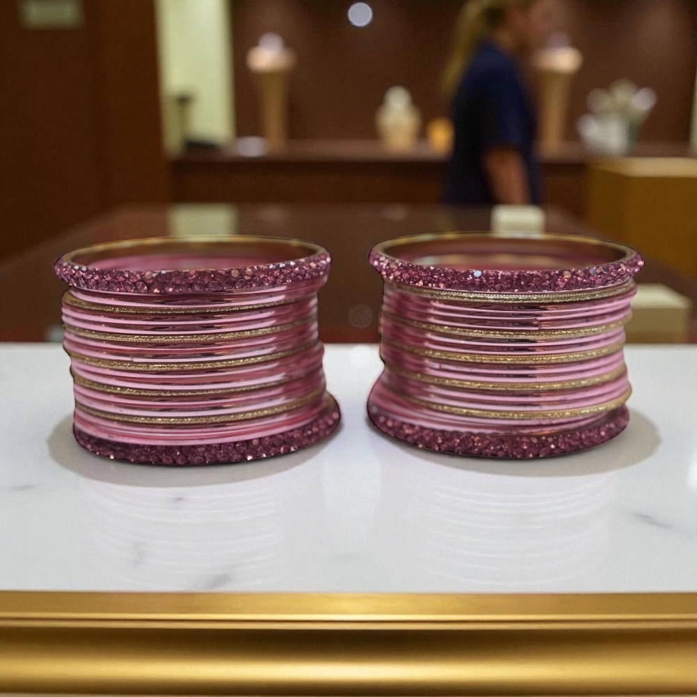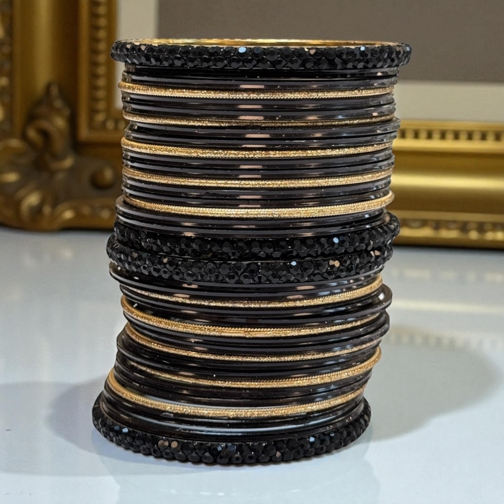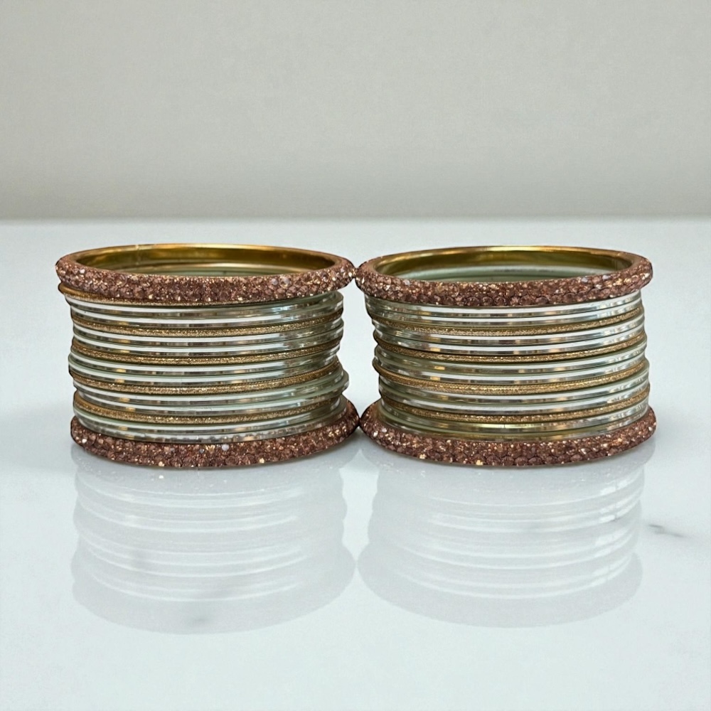 Elegant crystal bangle set featuring 4 churi bangles, 10 mixing bangles, and 24 colourful crystal bangles. Perfect for weddings, parties, or festive wear — lightweight, comfortable, and can be worn on one or both arms.