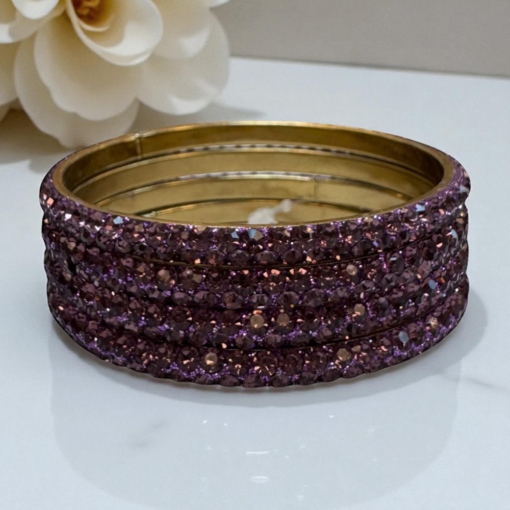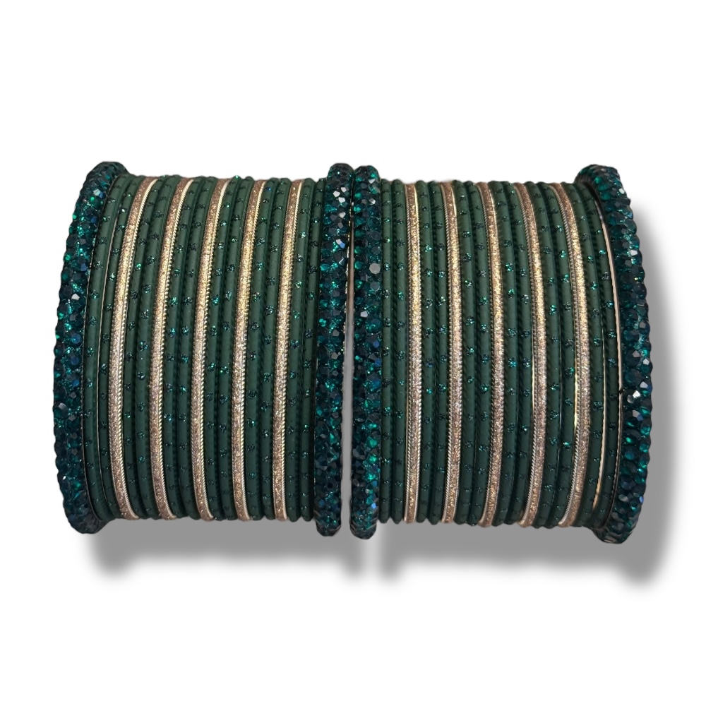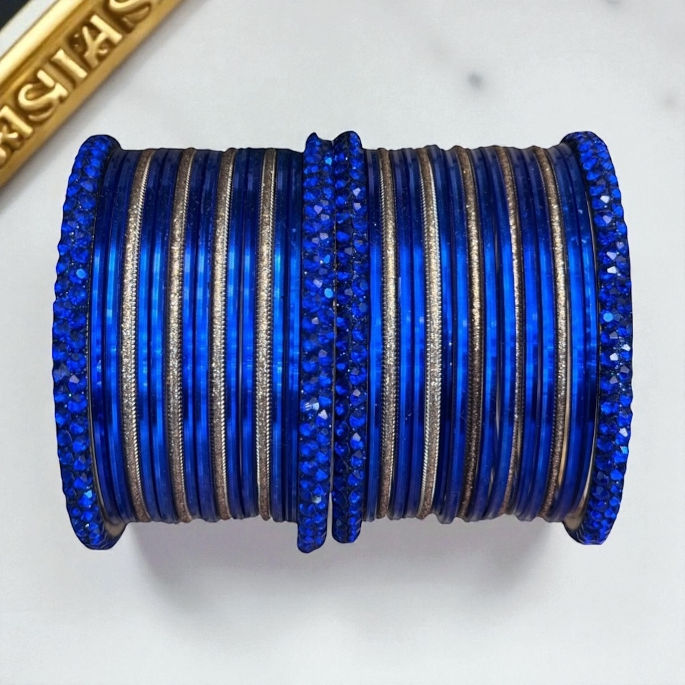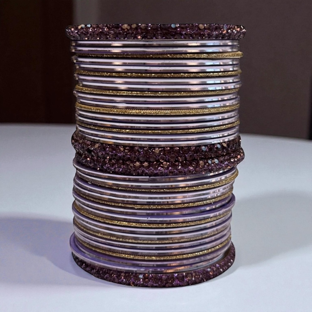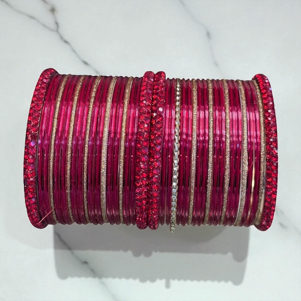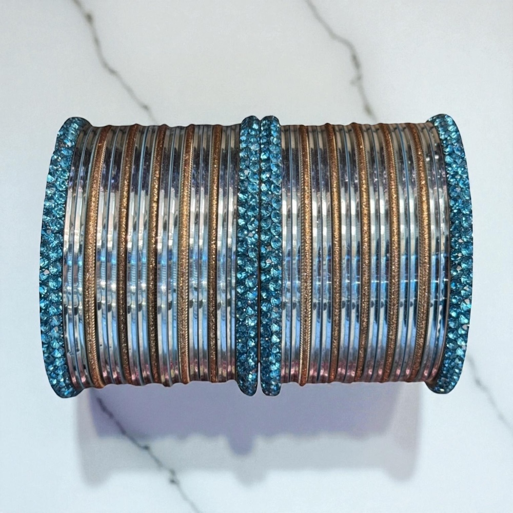 Elegant crystal bangle set featuring 4 churi bangles, 10 mixing bangles, and 24 colourful crystal bangles. Perfect for weddings, parties, or festive wear — lightweight, comfortable, and can be worn on one or both arms.