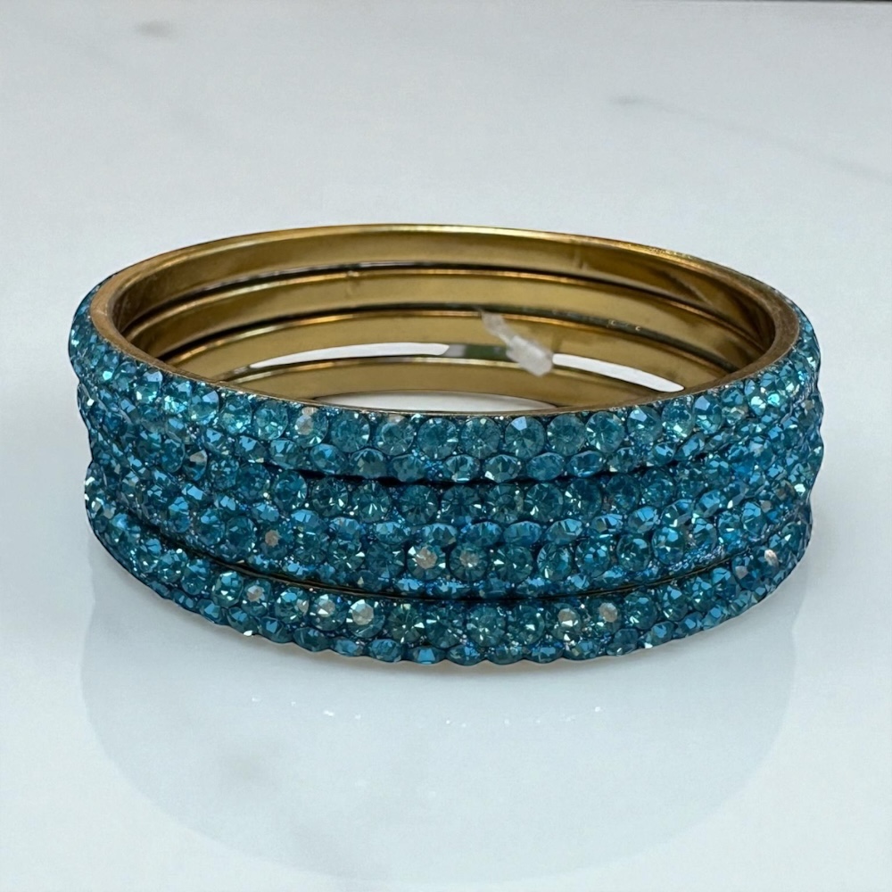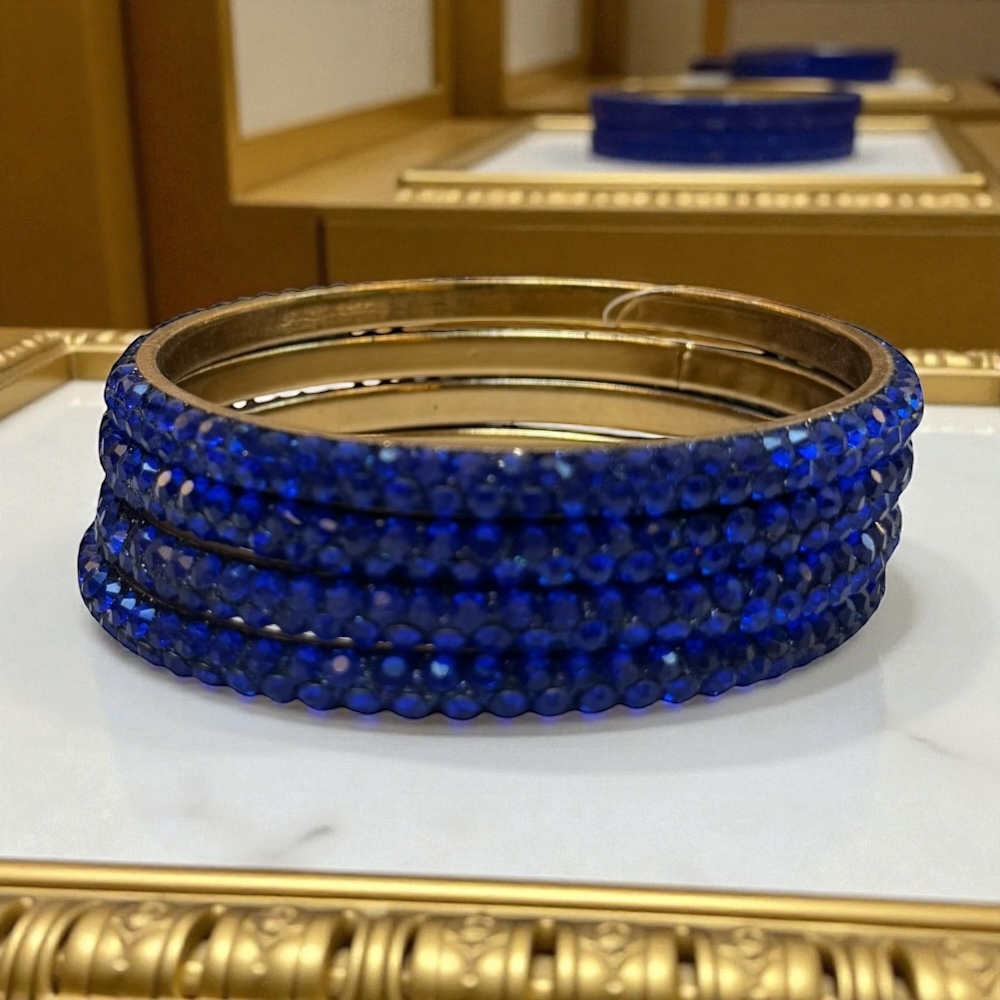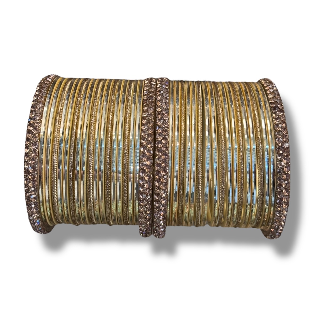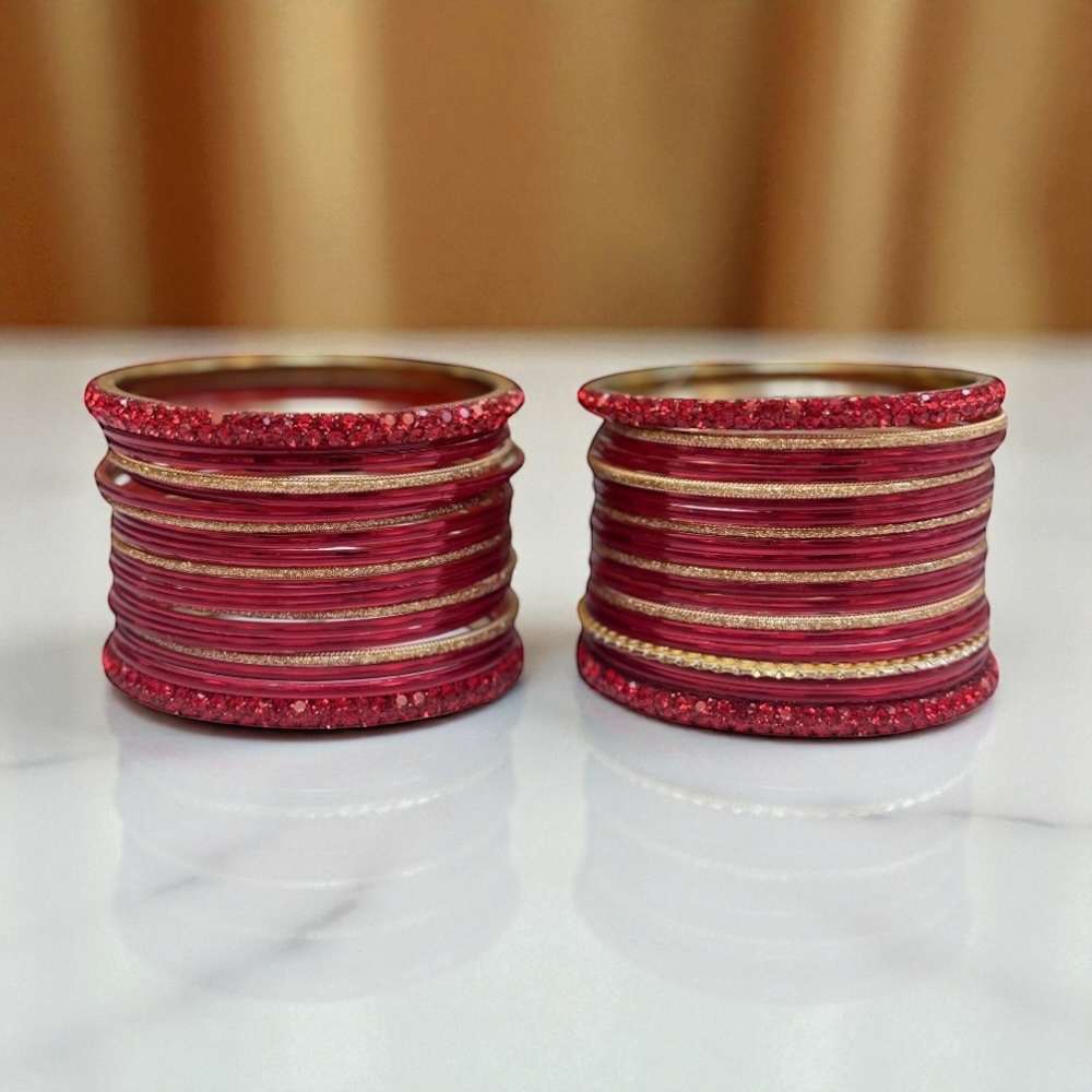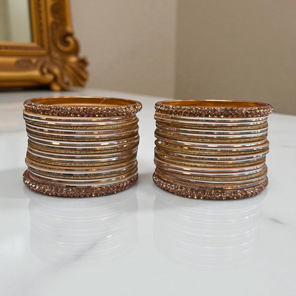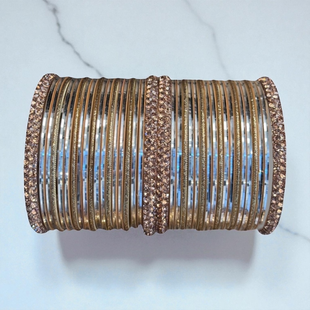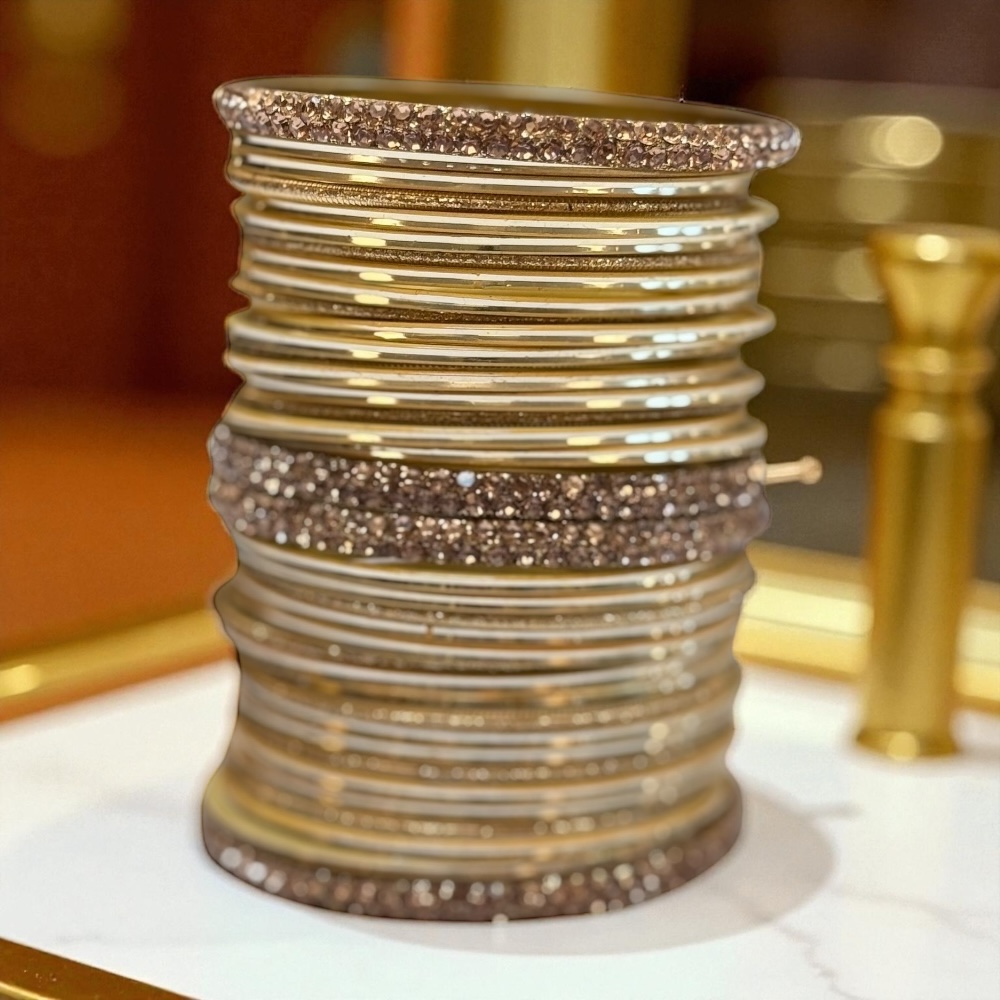 Elegant crystal bangle set featuring 4 churi bangles, 10 mixing bangles, and 24 colourful crystal bangles. Perfect for weddings, parties, or festive wear — lightweight, comfortable, and can be worn on one or both arms.
