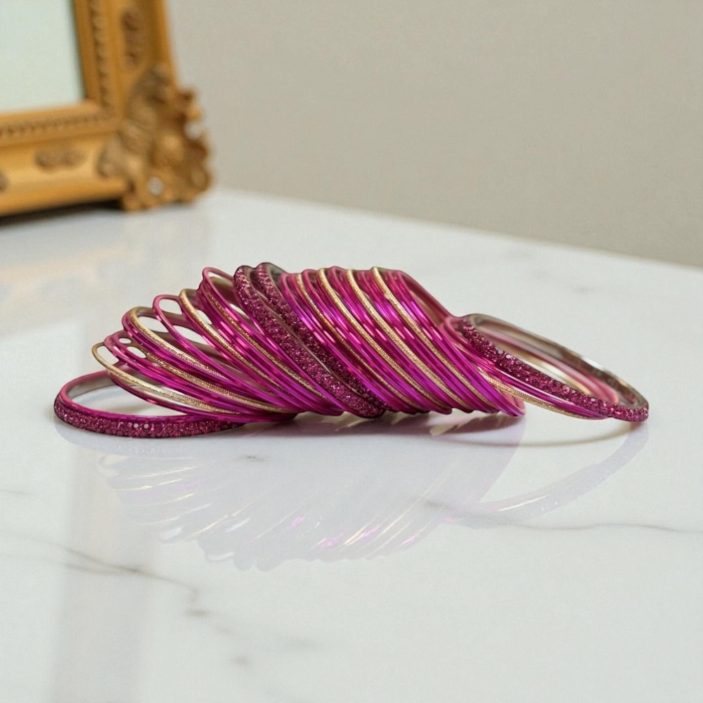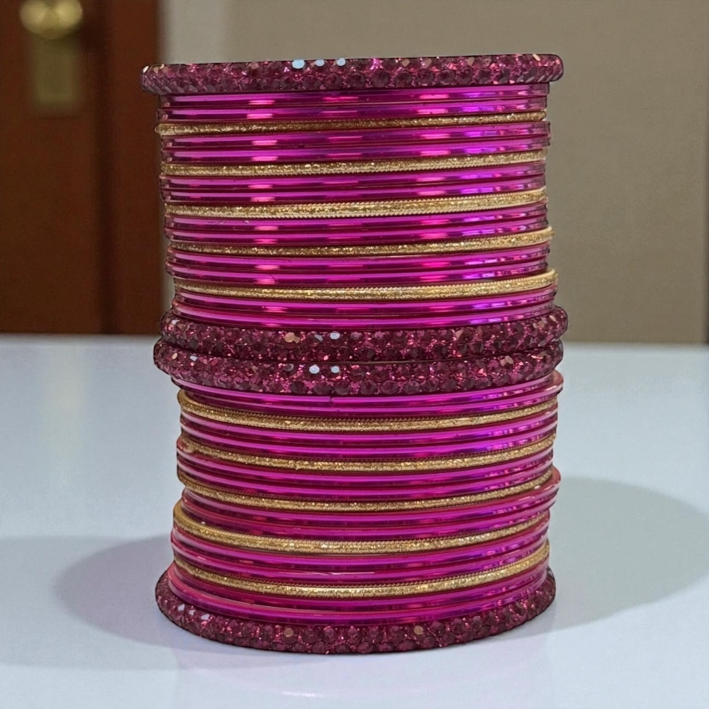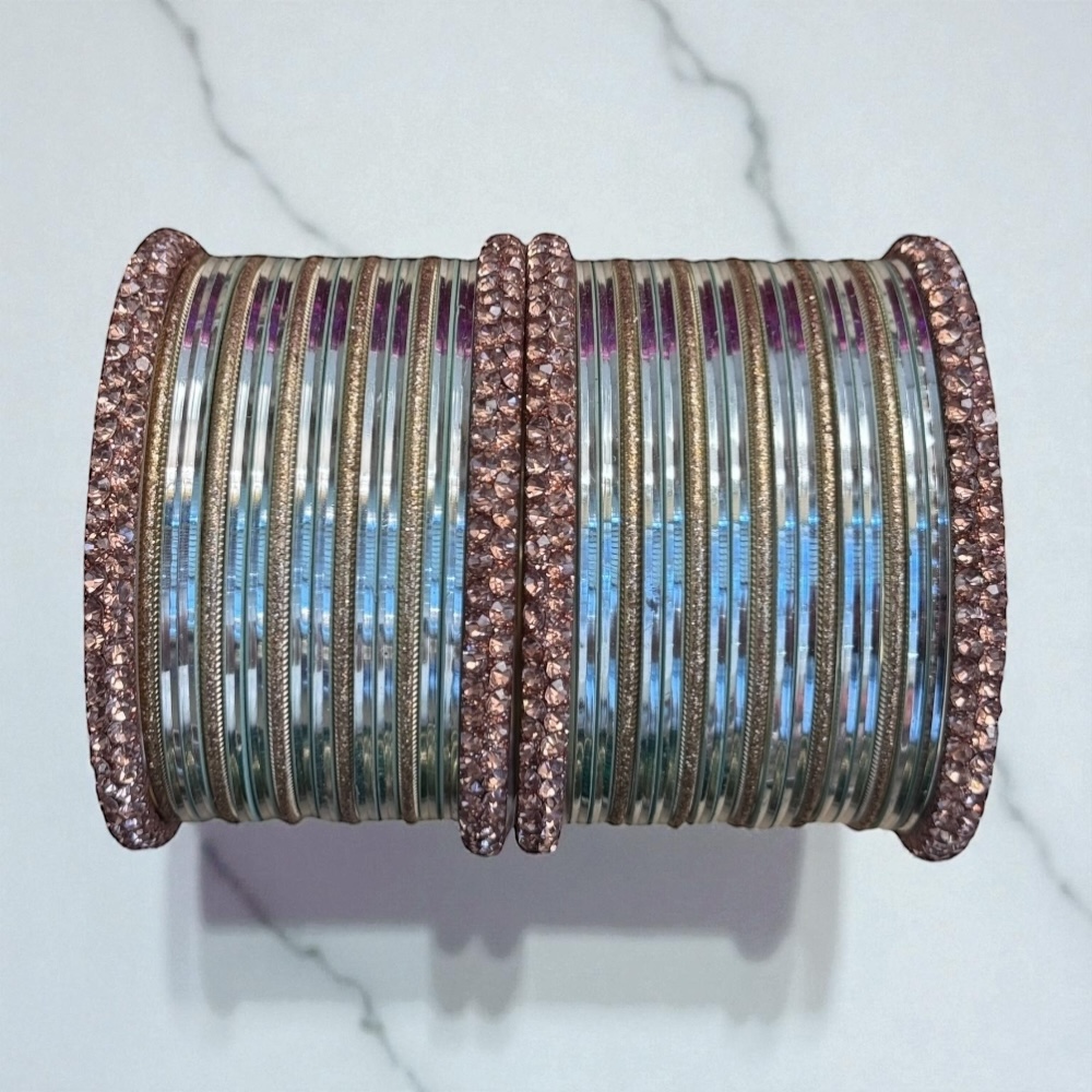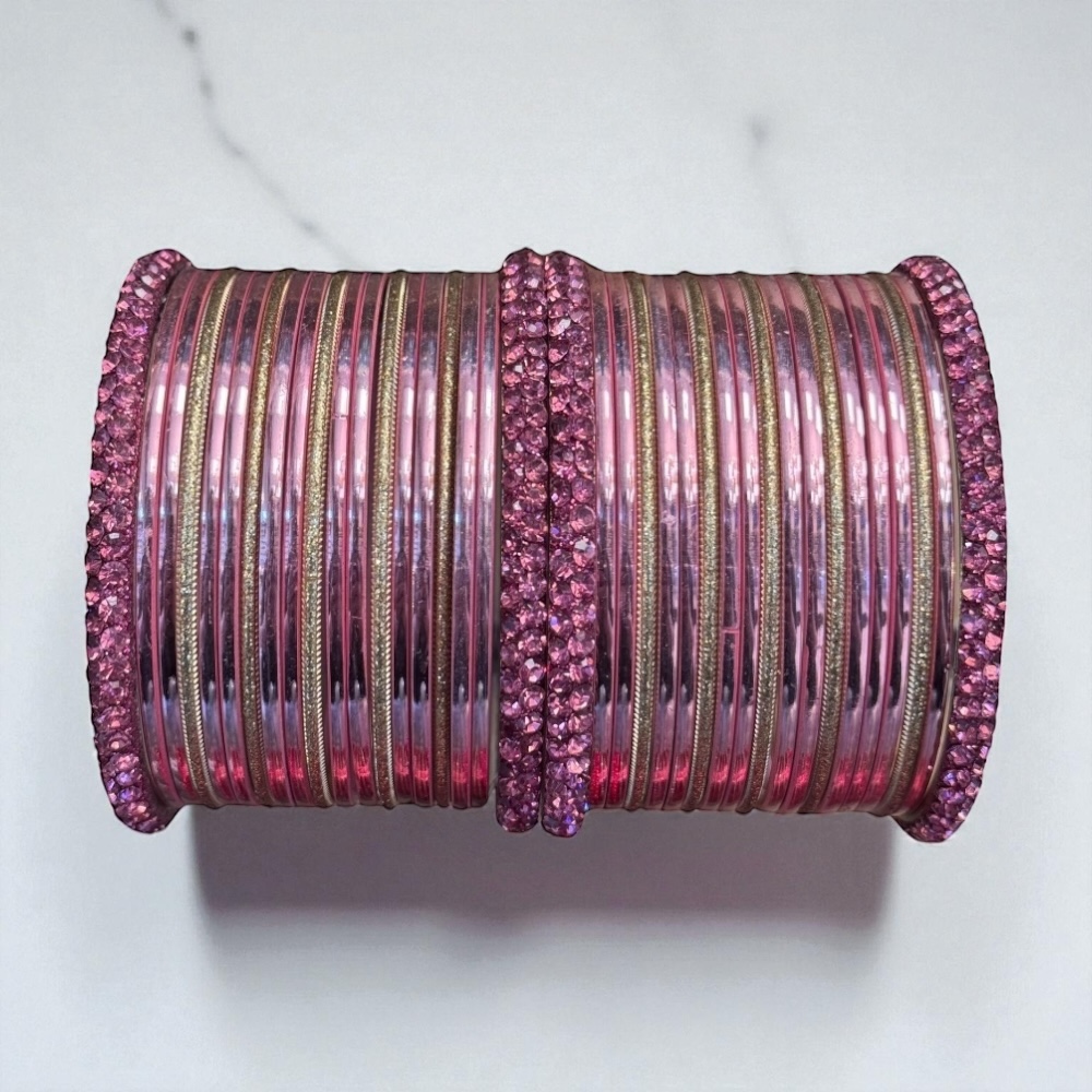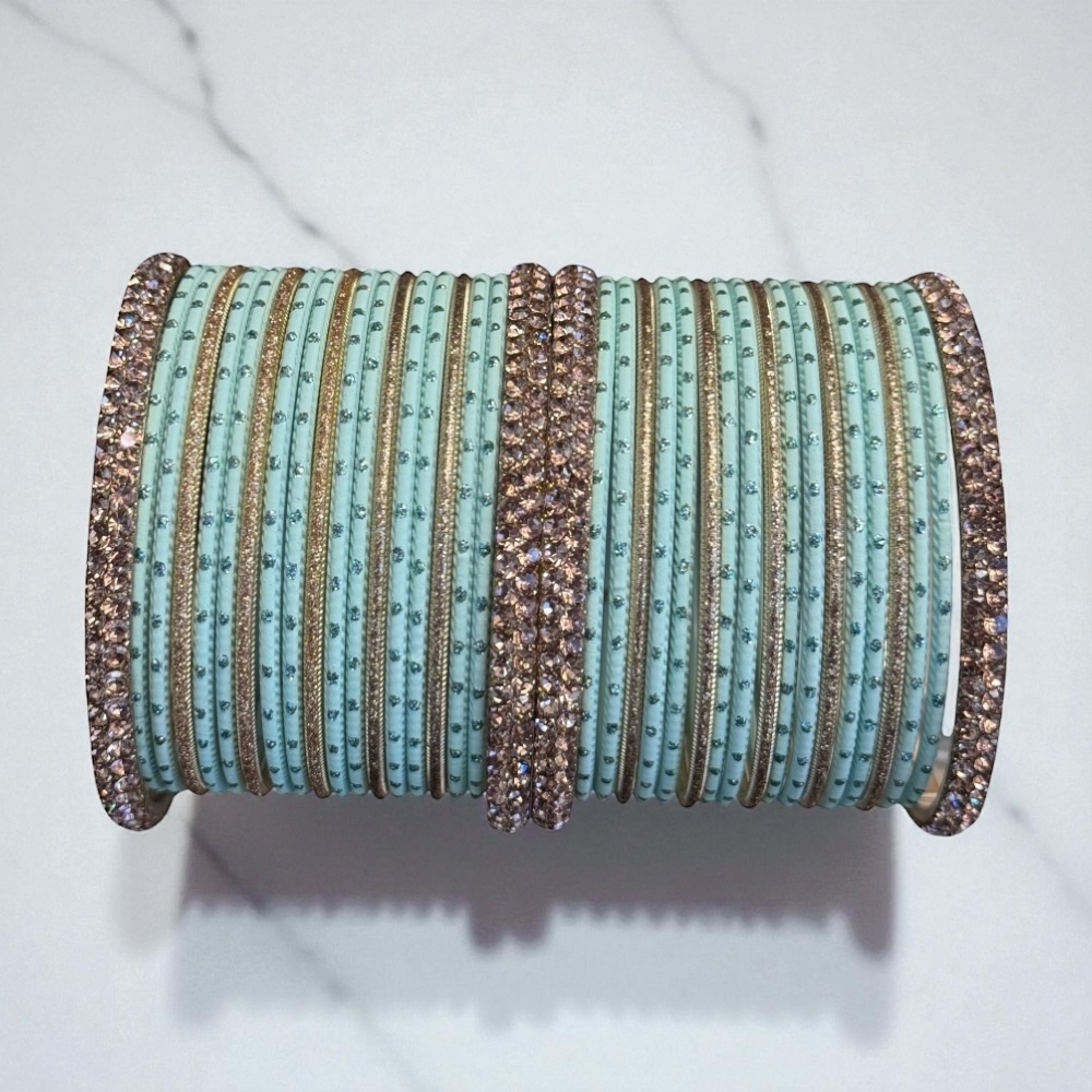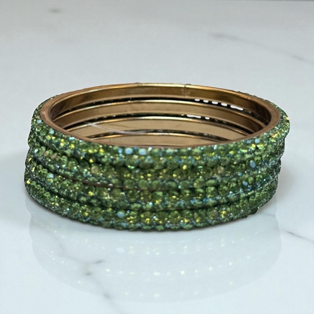 Elegant crystal bangle set featuring 4 churi bangles, 10 mixing bangles, and 24 colourful crystal bangles. Perfect for weddings, parties, or festive wear — lightweight, comfortable, and can be worn on one or both arms.