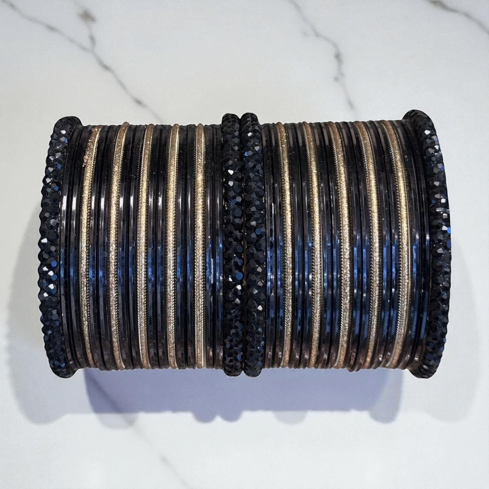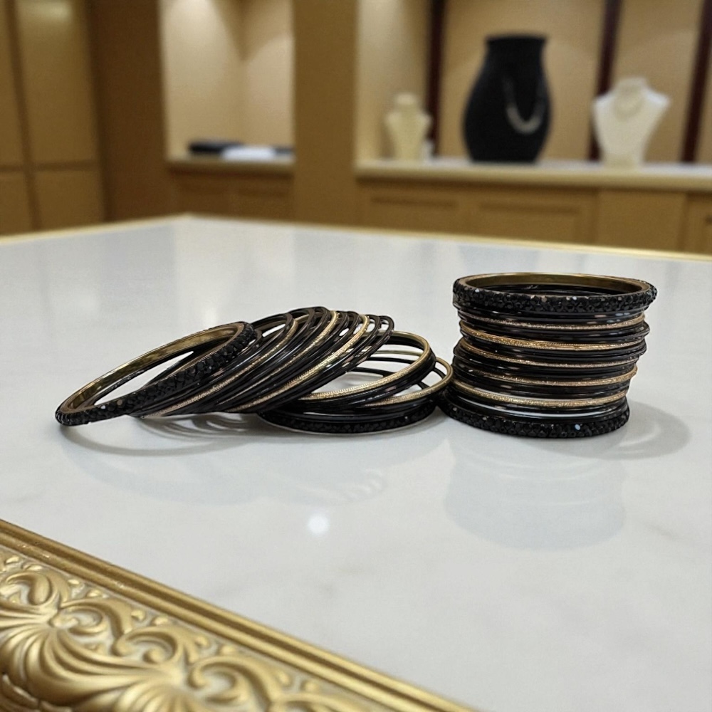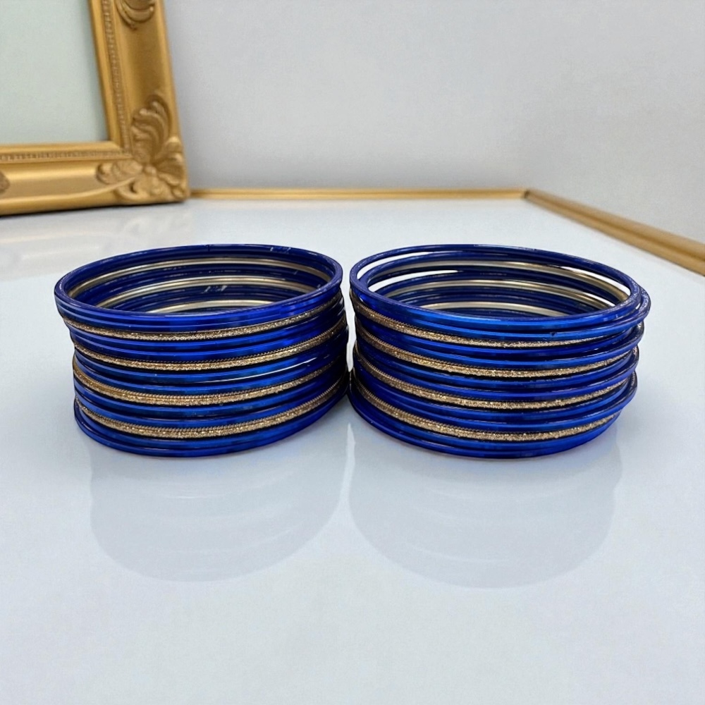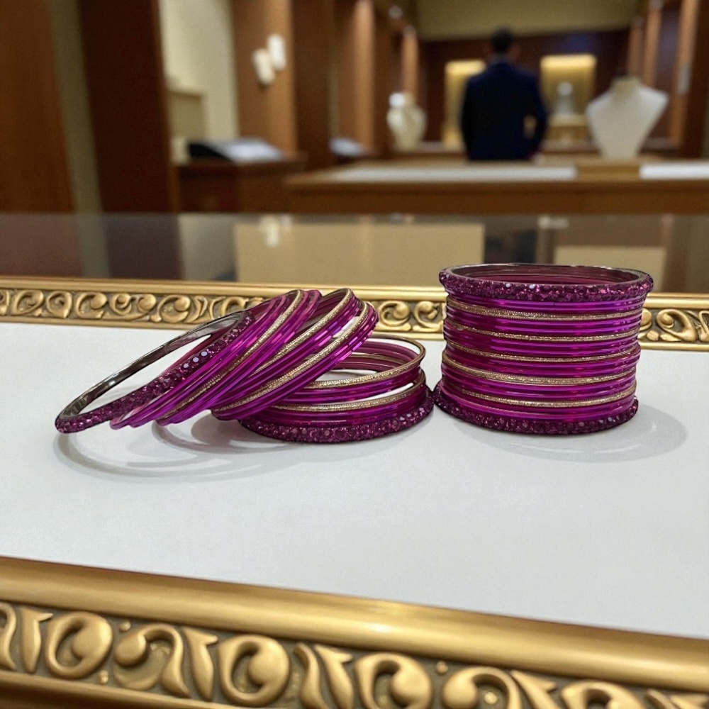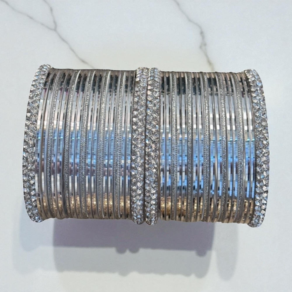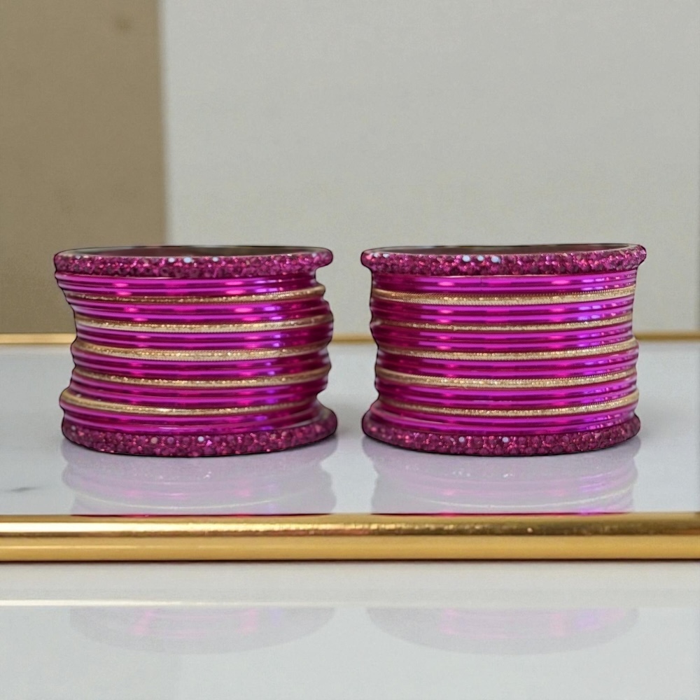 Elegant crystal bangle set featuring 4 churi bangles, 10 mixing bangles, and 24 colourful crystal bangles. Perfect for weddings, parties, or festive wear — lightweight, comfortable, and can be worn on one or both arms.