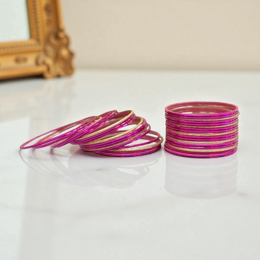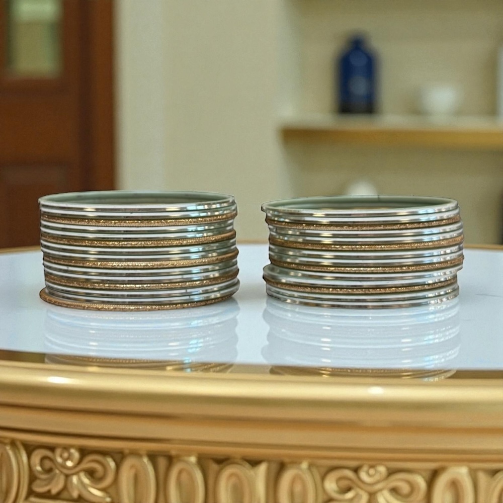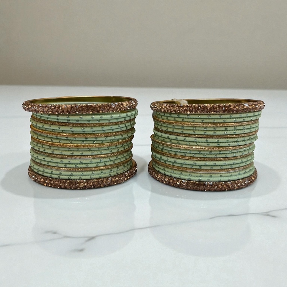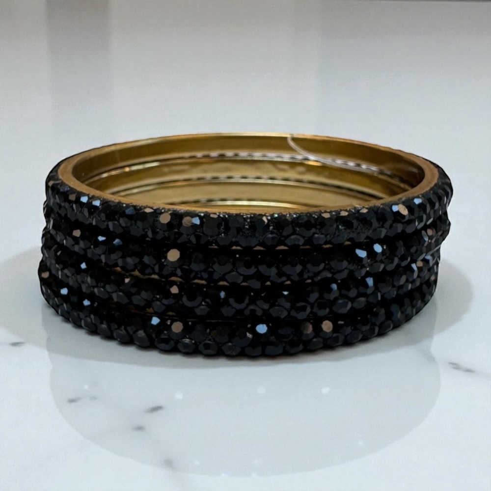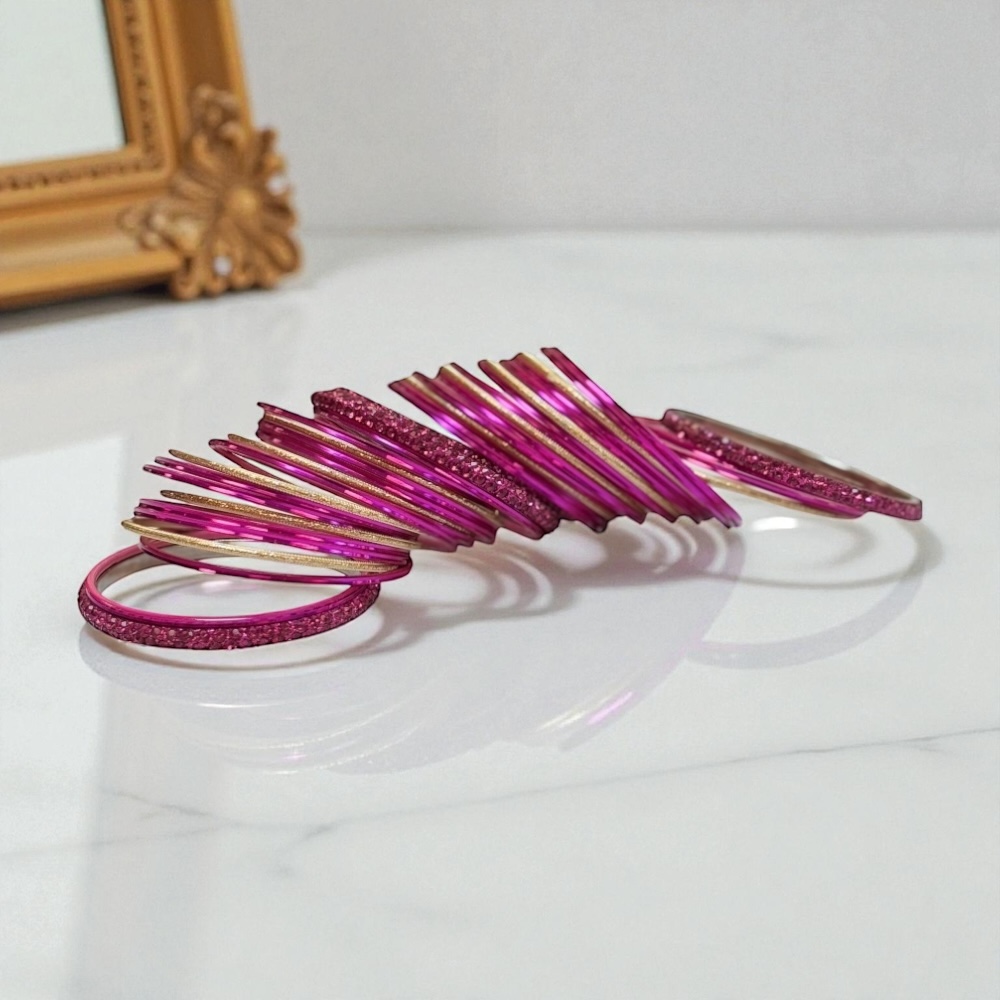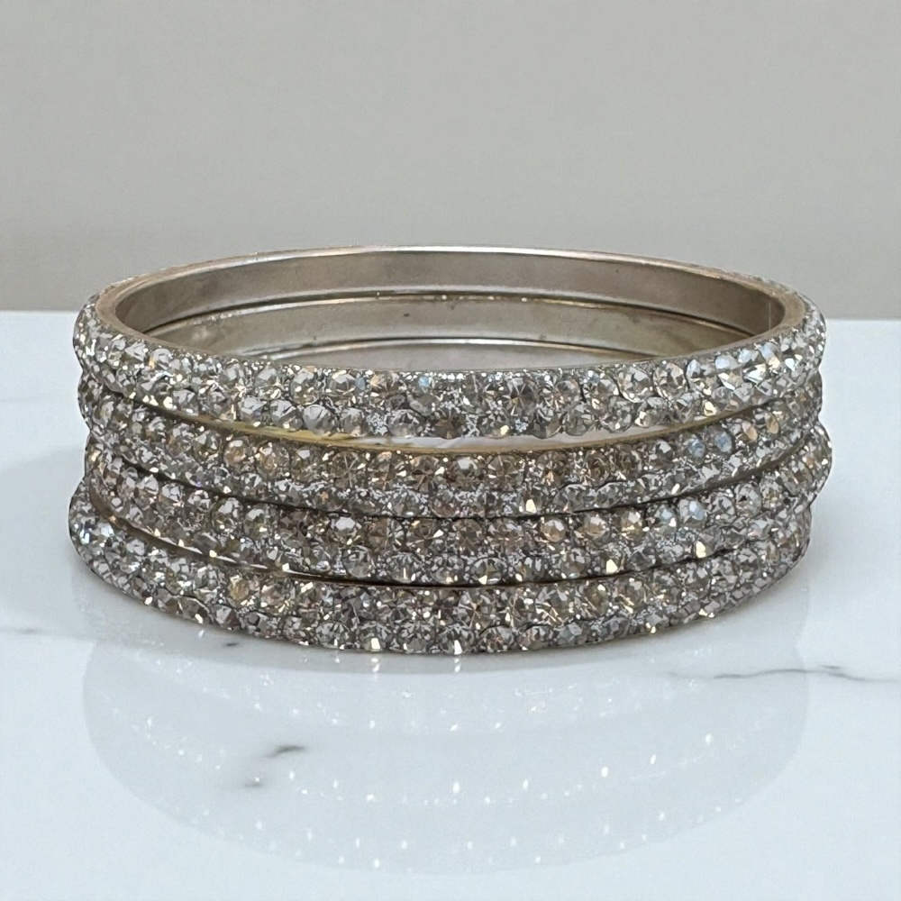 Elegant crystal bangle set featuring 4 churi bangles, 10 mixing bangles, and 24 colourful crystal bangles. Perfect for weddings, parties, or festive wear — lightweight, comfortable, and can be worn on one or both arms.