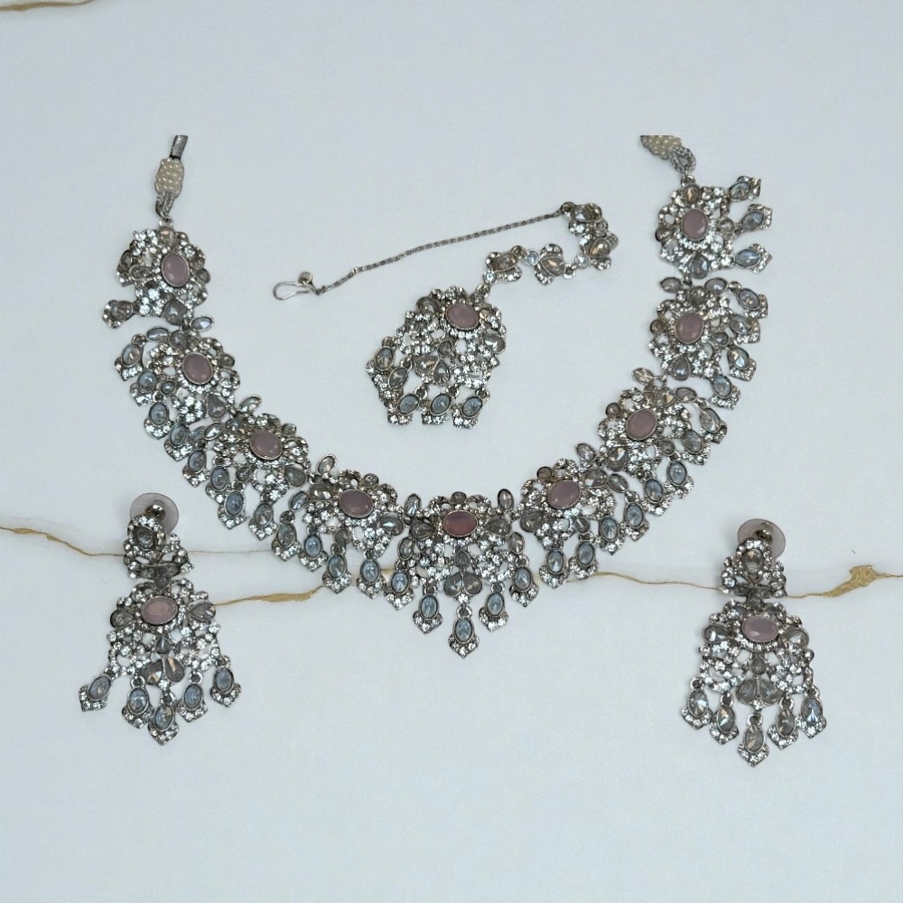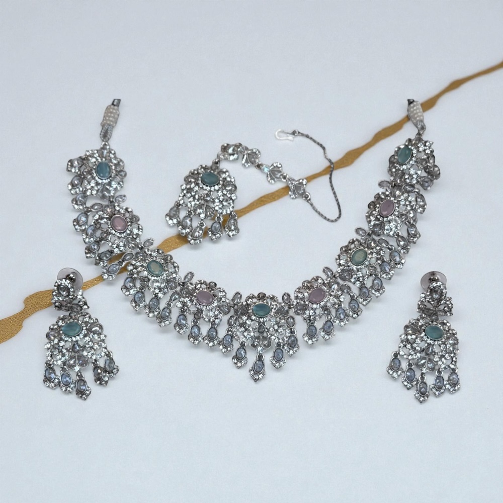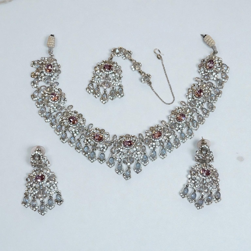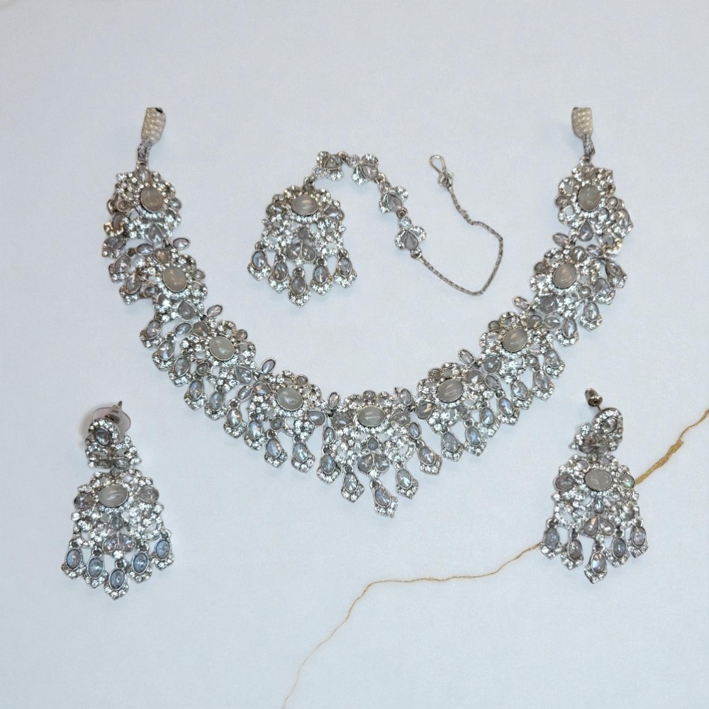 Elegant crystal-based jewellery set featuring a necklace, earrings, and tikka. Designed with shimmering crystal stones that can also be styled as a choker — perfect for bridal, festive, or party wear.