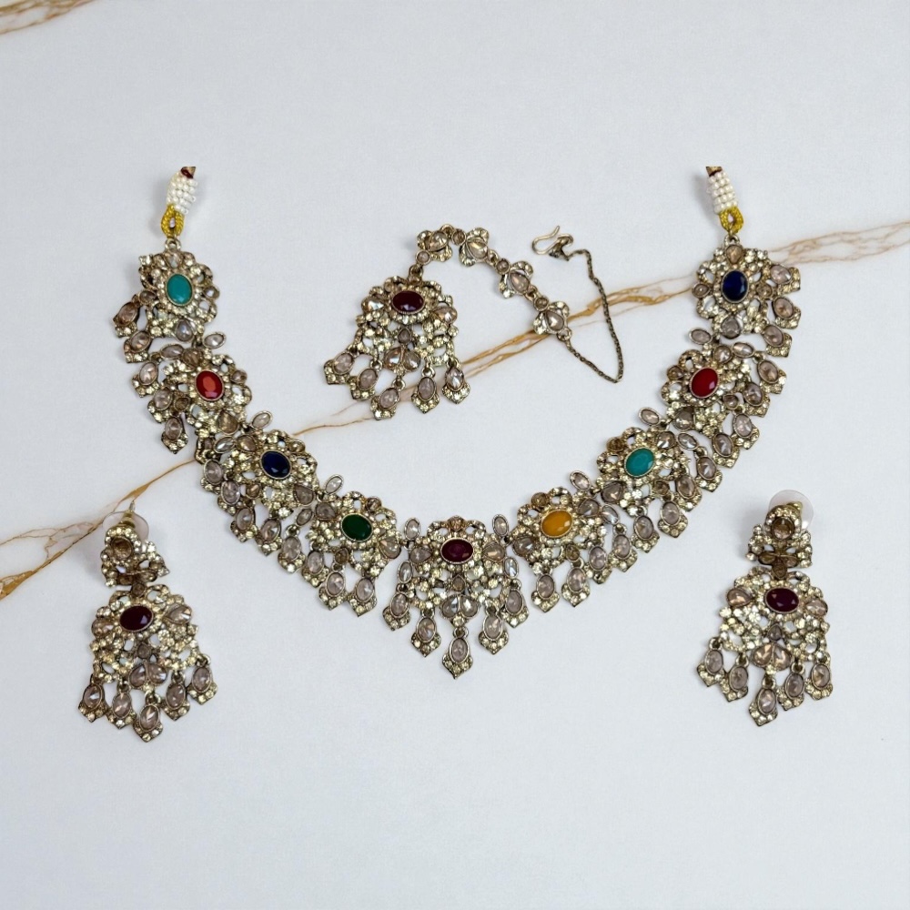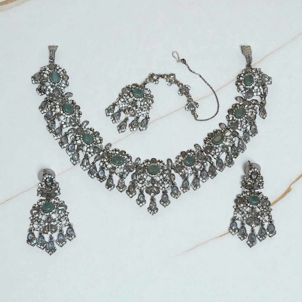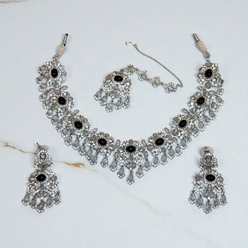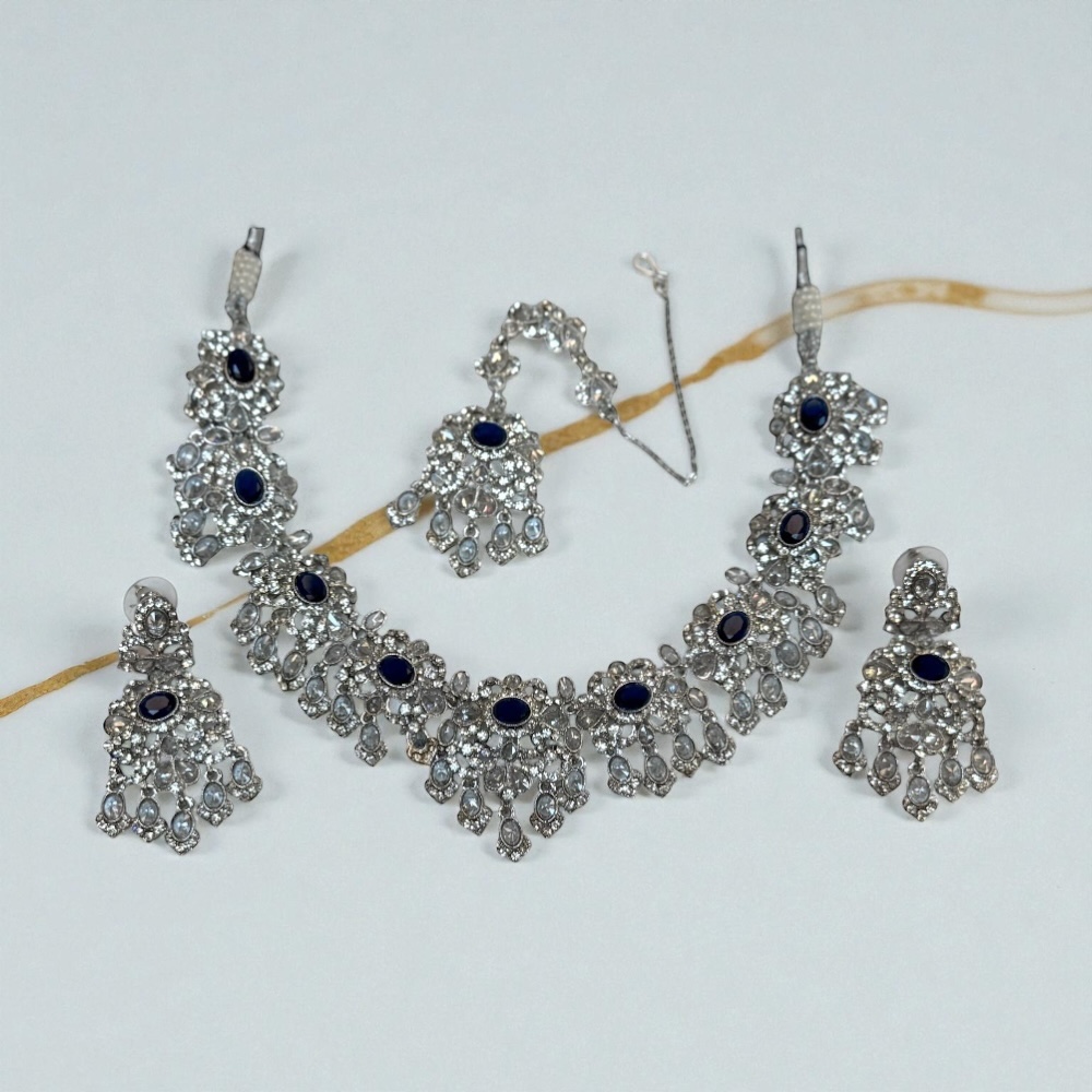 Elegant crystal-based jewellery set featuring a necklace, earrings, and tikka. Designed with shimmering crystal stones that can also be styled as a choker — perfect for bridal, festive, or party wear.