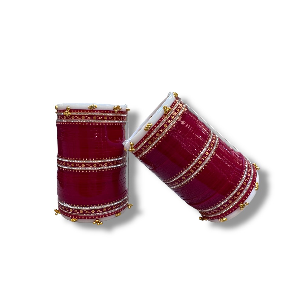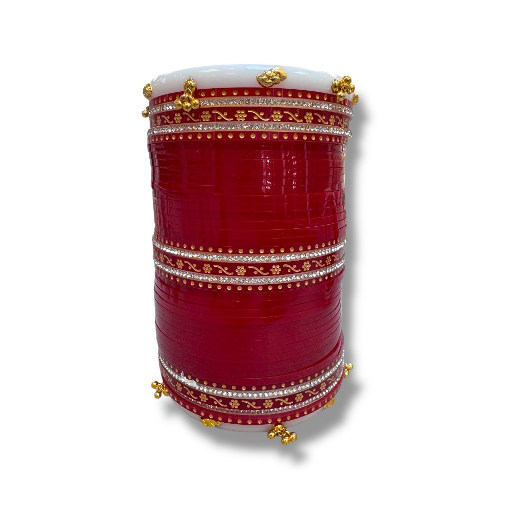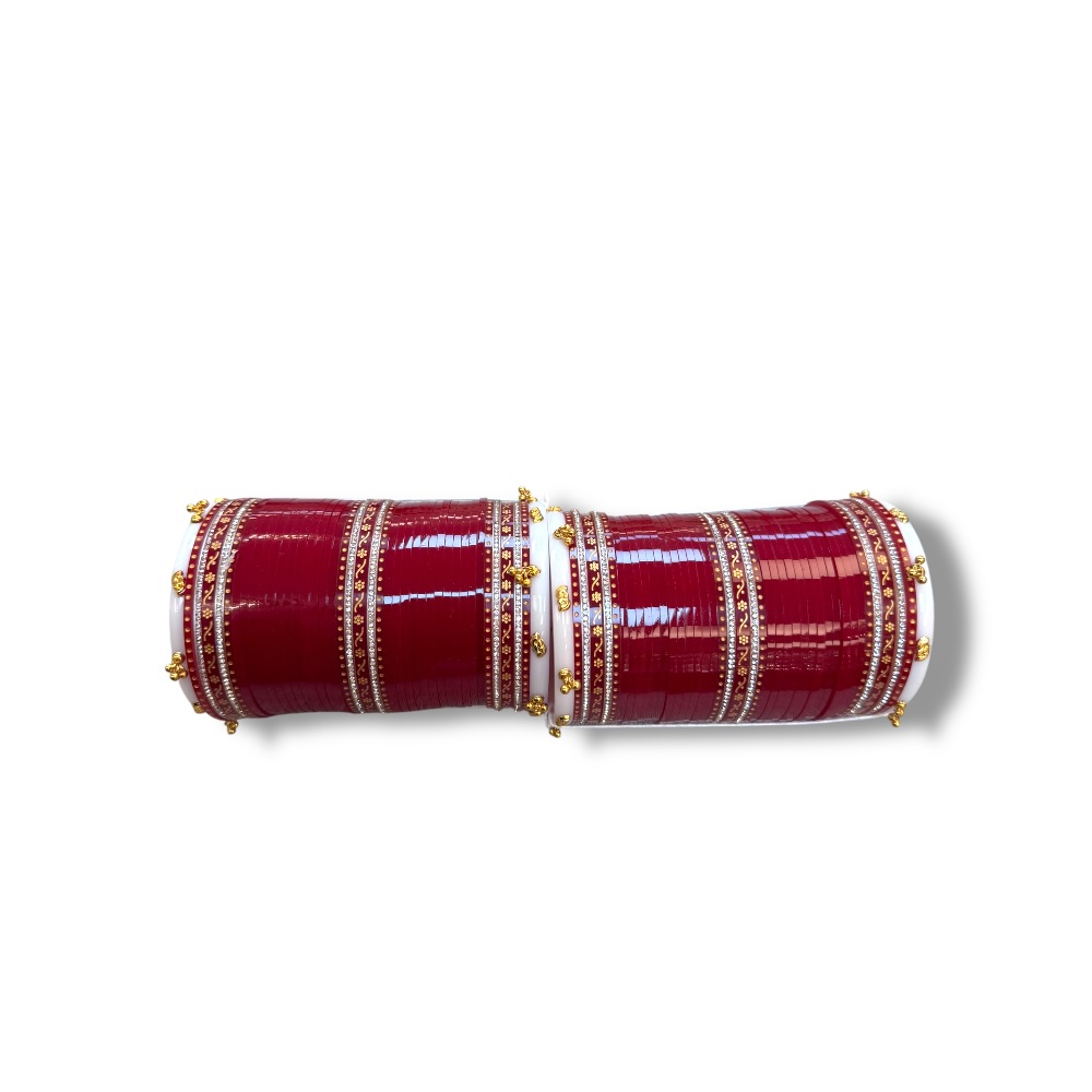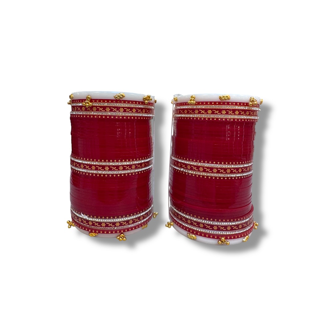 Complete your bridal look with this stunning Red & Gold Wedding Choora Set. Featuring traditional Punjabi chura design, these Shaadi bangles symbolize love and marital bliss. A perfect addition for Indian weddings, offering timeless beauty and cultural significance.