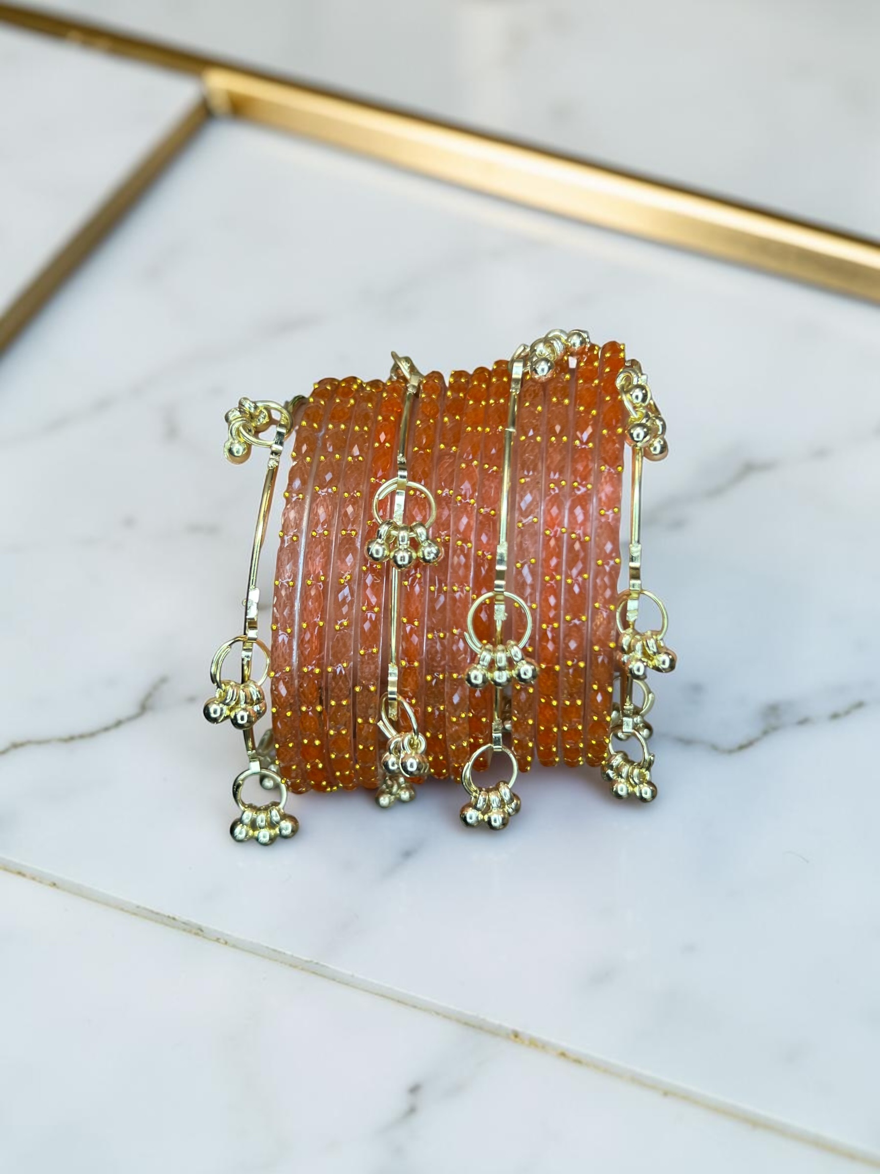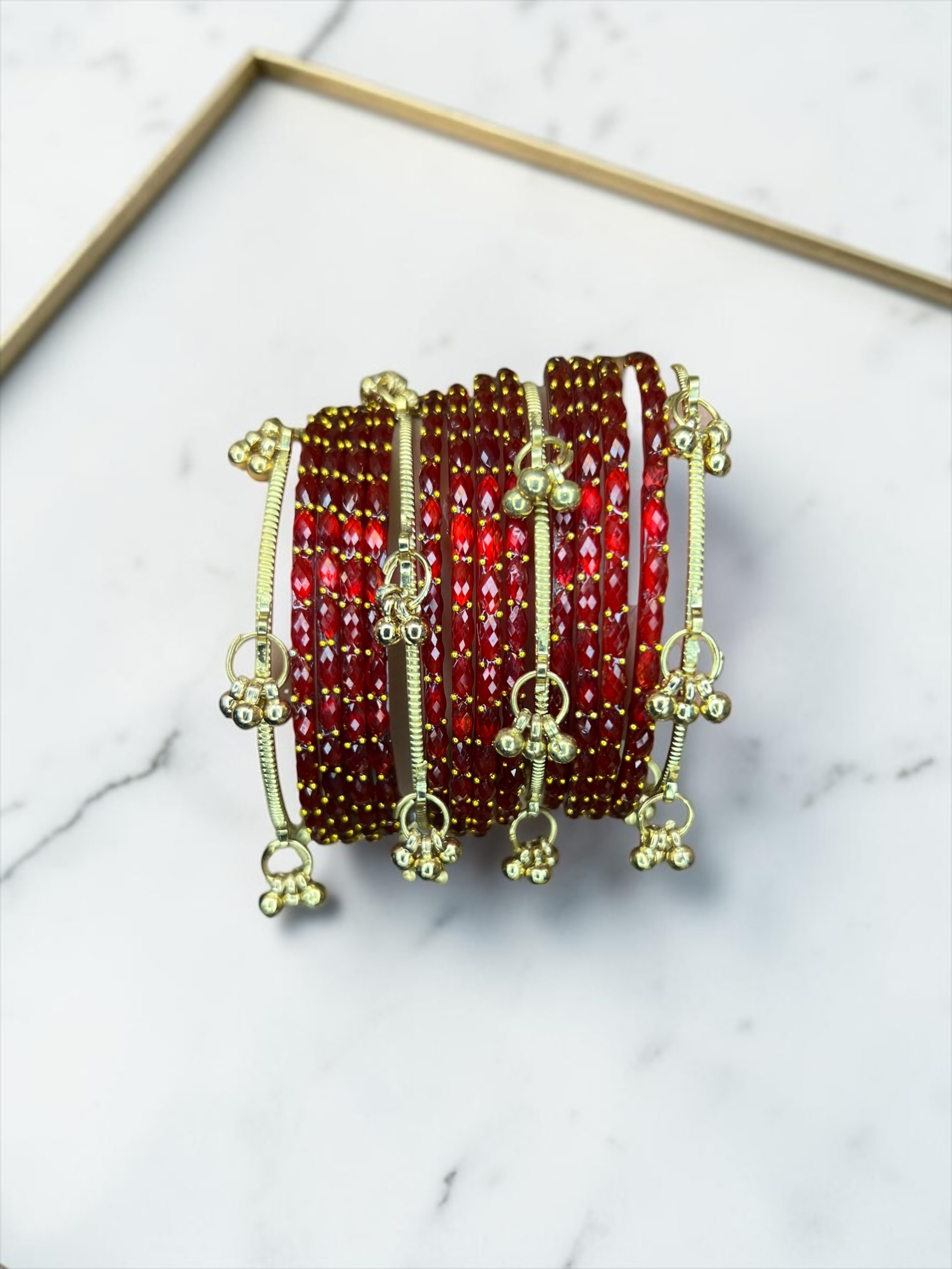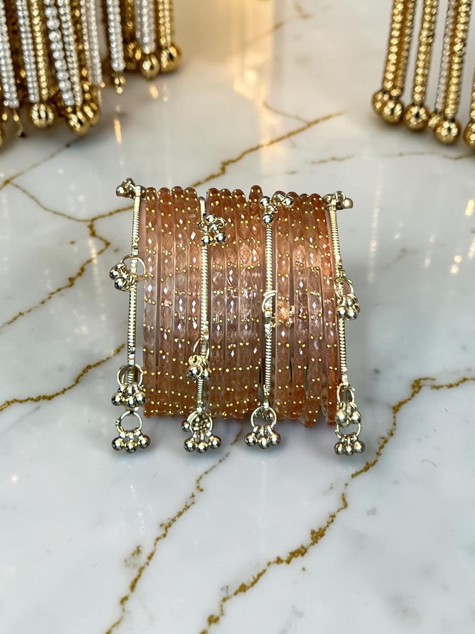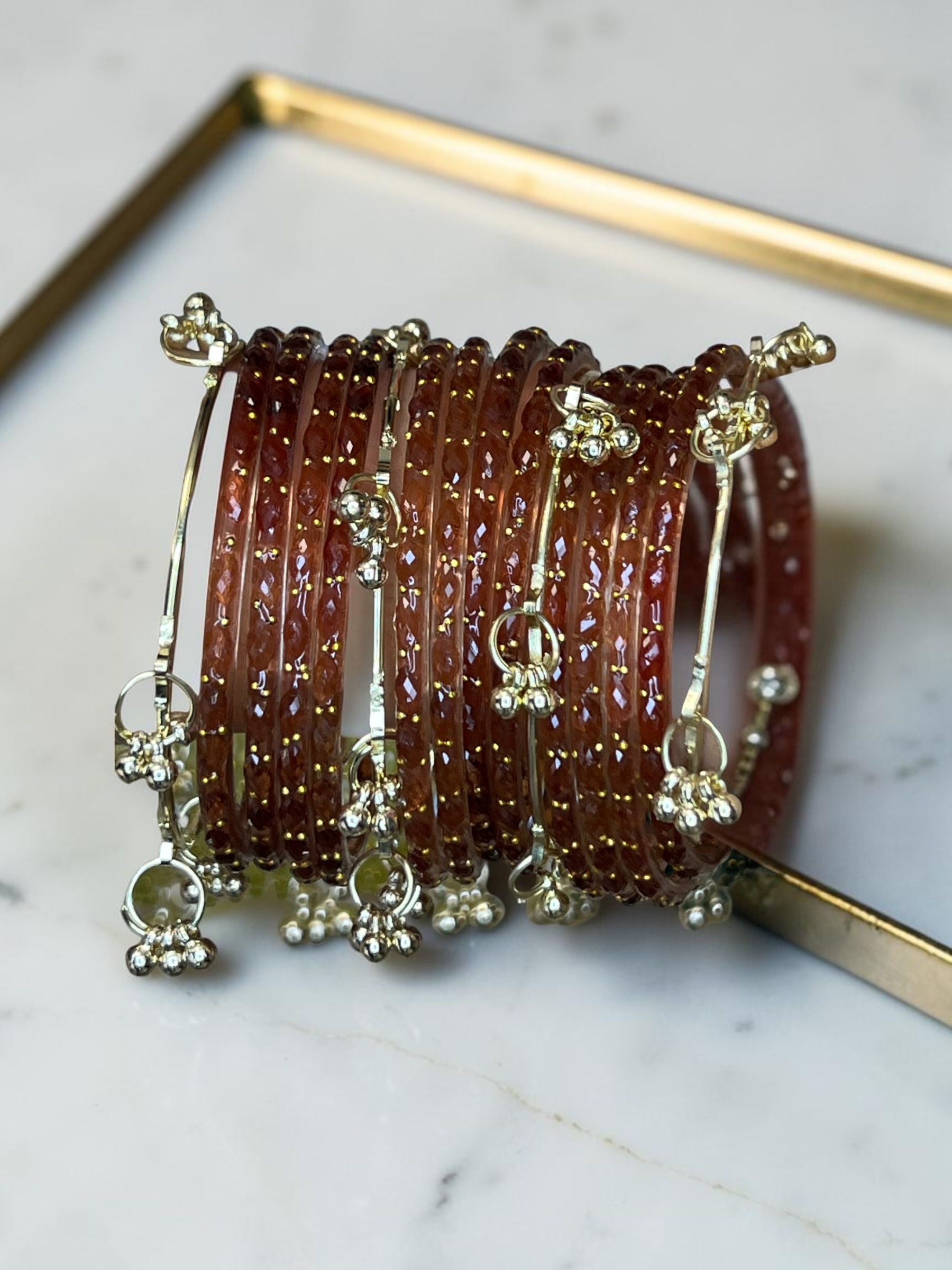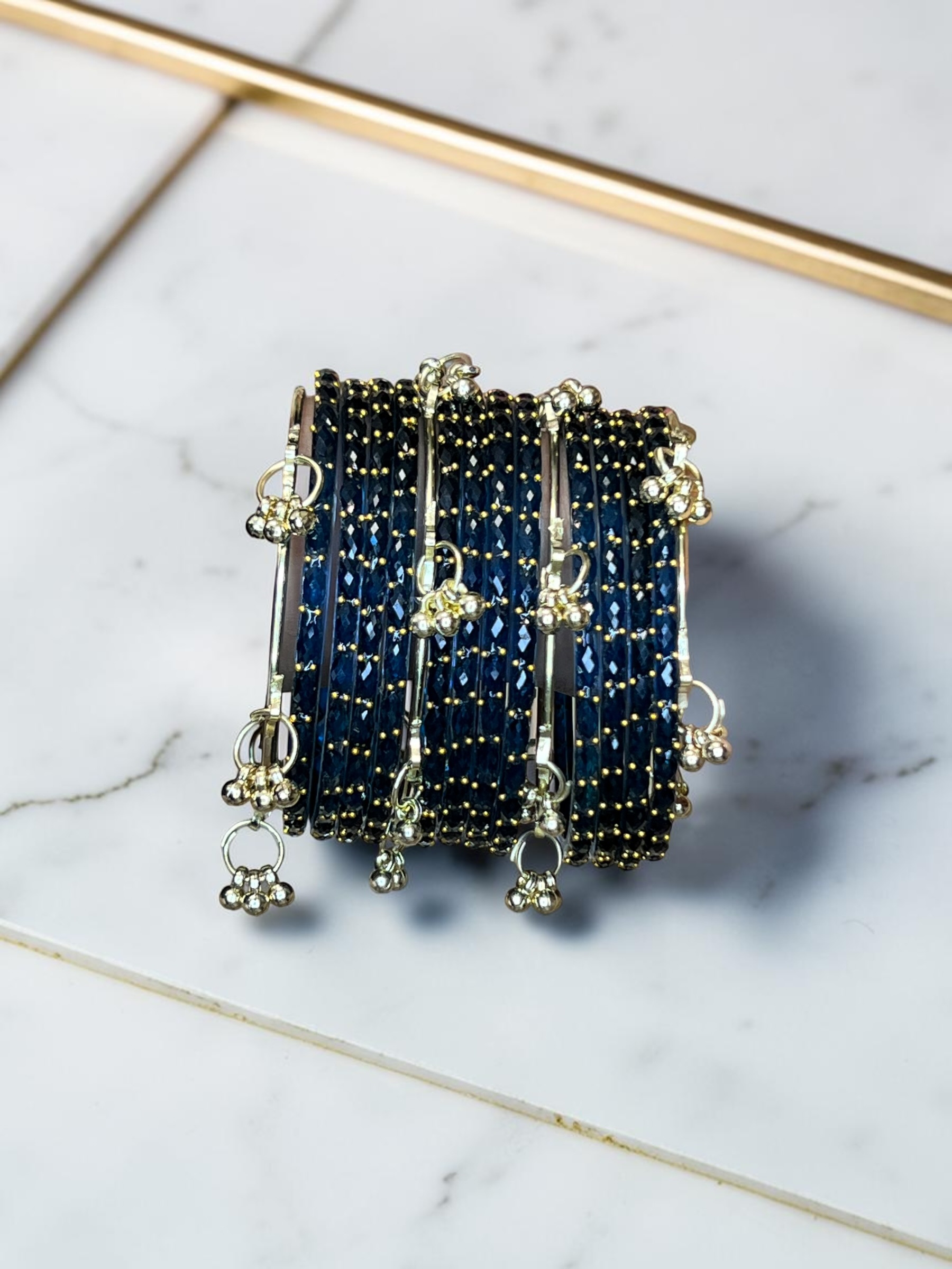 Add timeless charm to your jewelry collection with this beautifully crafted Bridal Churi Set. Featuring a combination of 12 glass raindrop bangles and 4 Kashmiri Kungru bangles, this set blends classic tradition with intricate detailing.