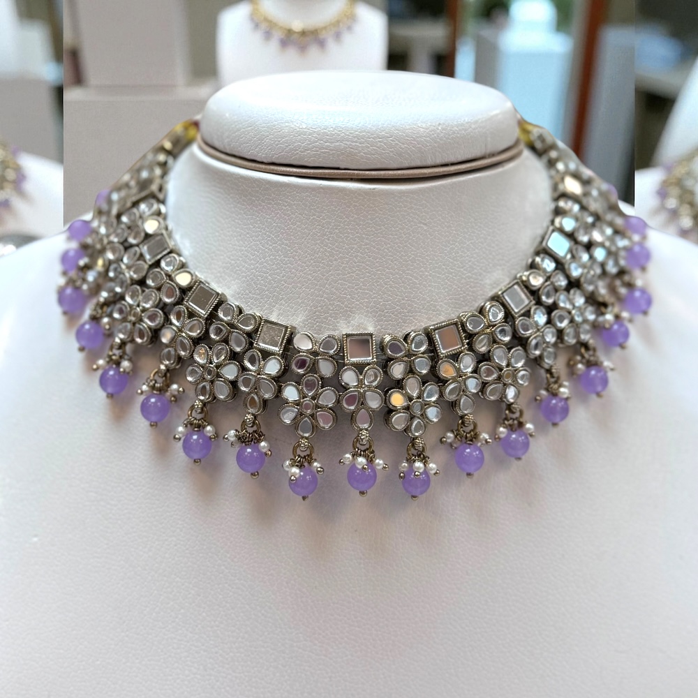 Handmade Lilac Beaded Mirror Necklace Set Antique Silver Finish Ethnic Indian Choker Jewellery Boho Traditional Necklace Wedding Festive Wear