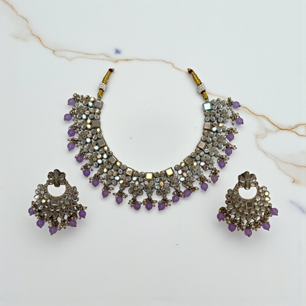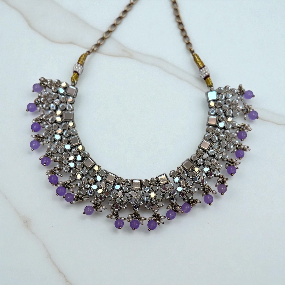 Bring timeless charm to your wardrobe with this Handmade Lilac Beaded Mirror Necklace Set. Crafted with intricate mirror work and antique silver finishing, this ethnic Indian choker set is the perfect accessory for women who love elegant and traditional jewellery.