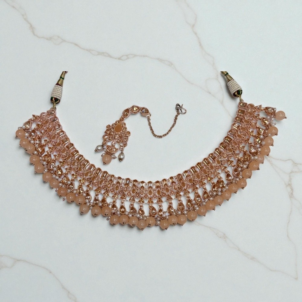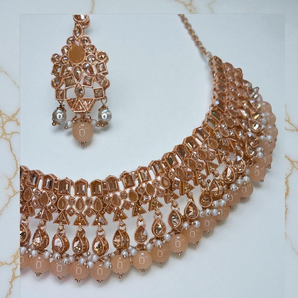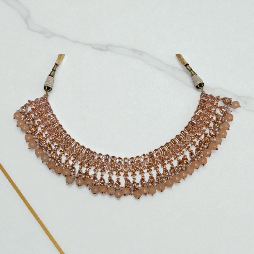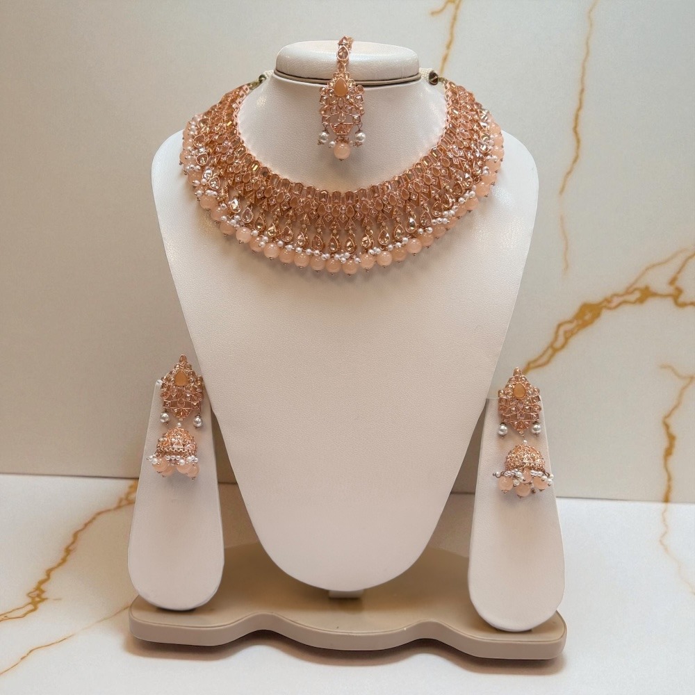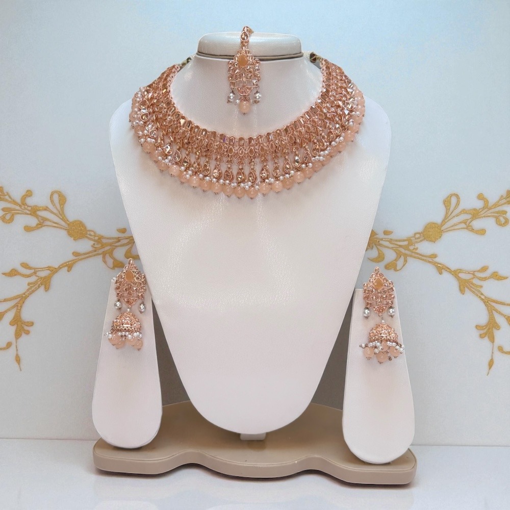 Crafted with attention to detail, this rose-colored set is perfect for luxury jewelry lovers who want an ethnic, bridal, and party-ready look. Add this stunning set to your collection and make every occasion special.