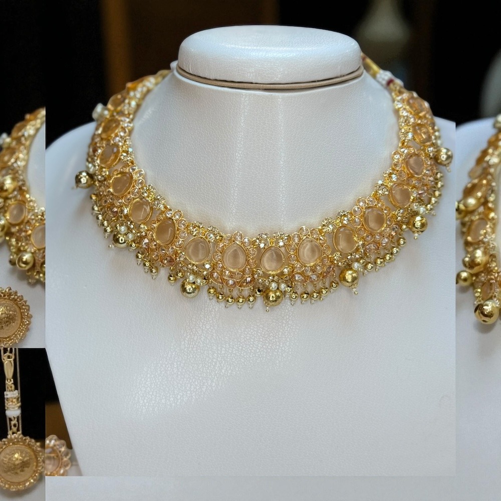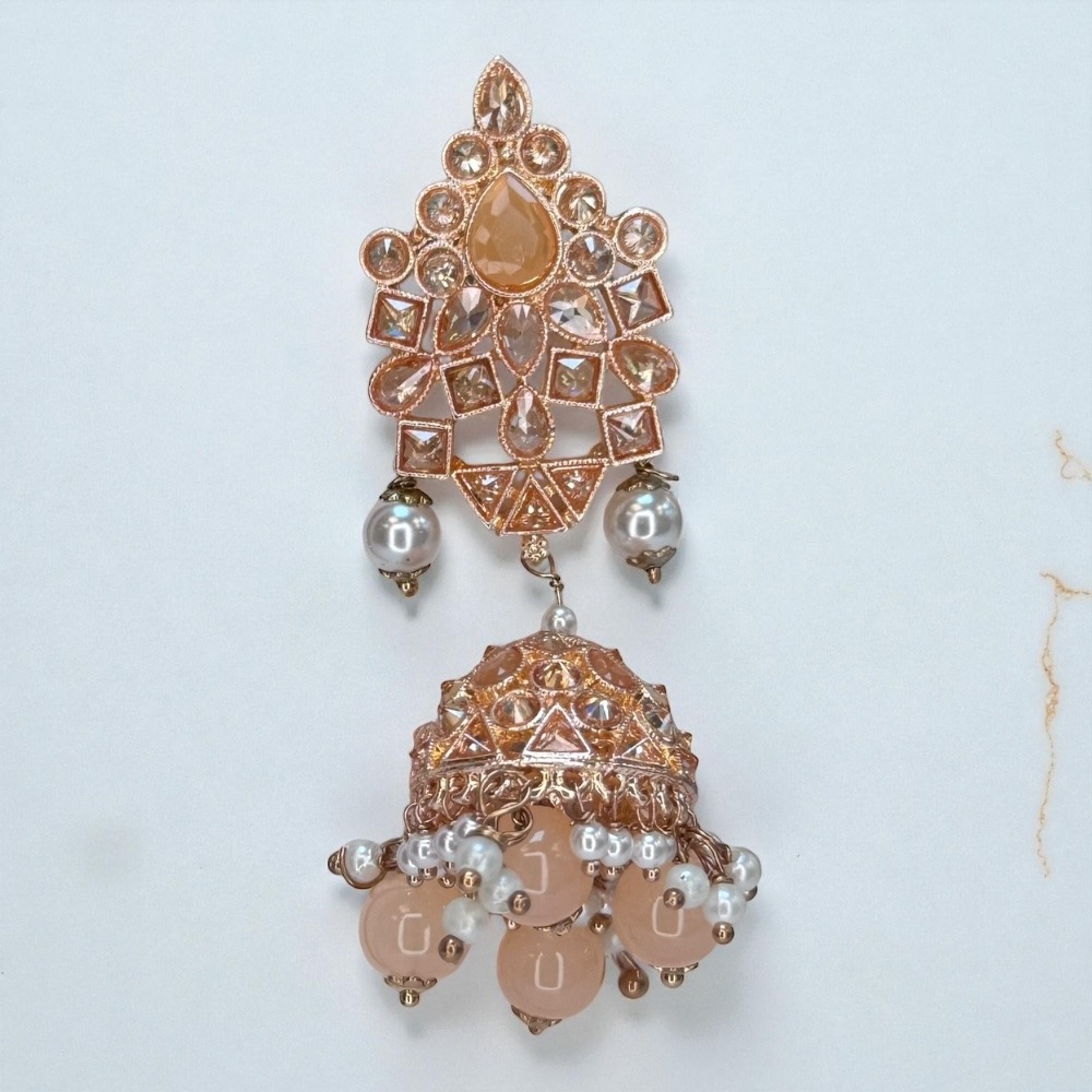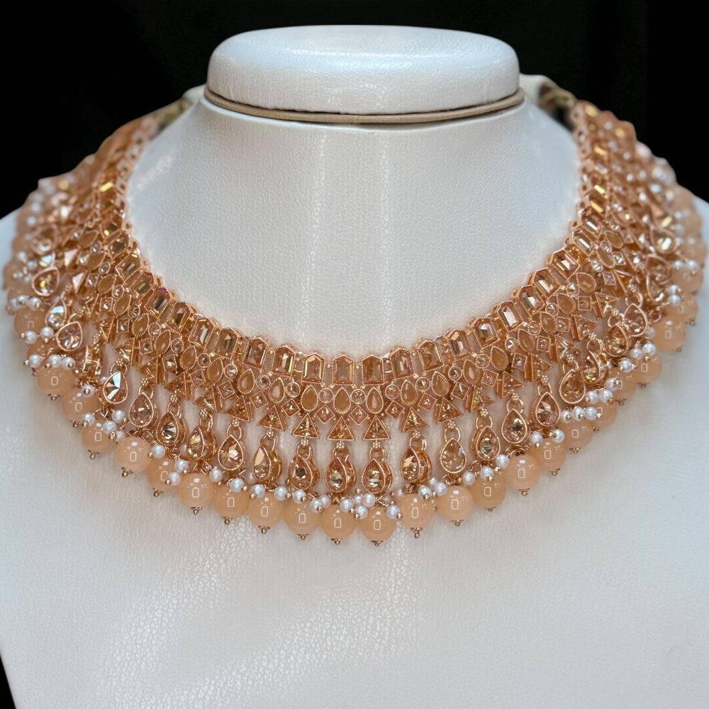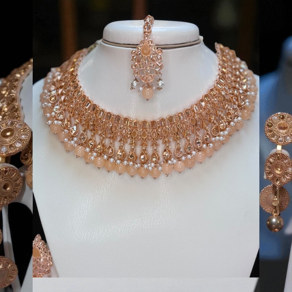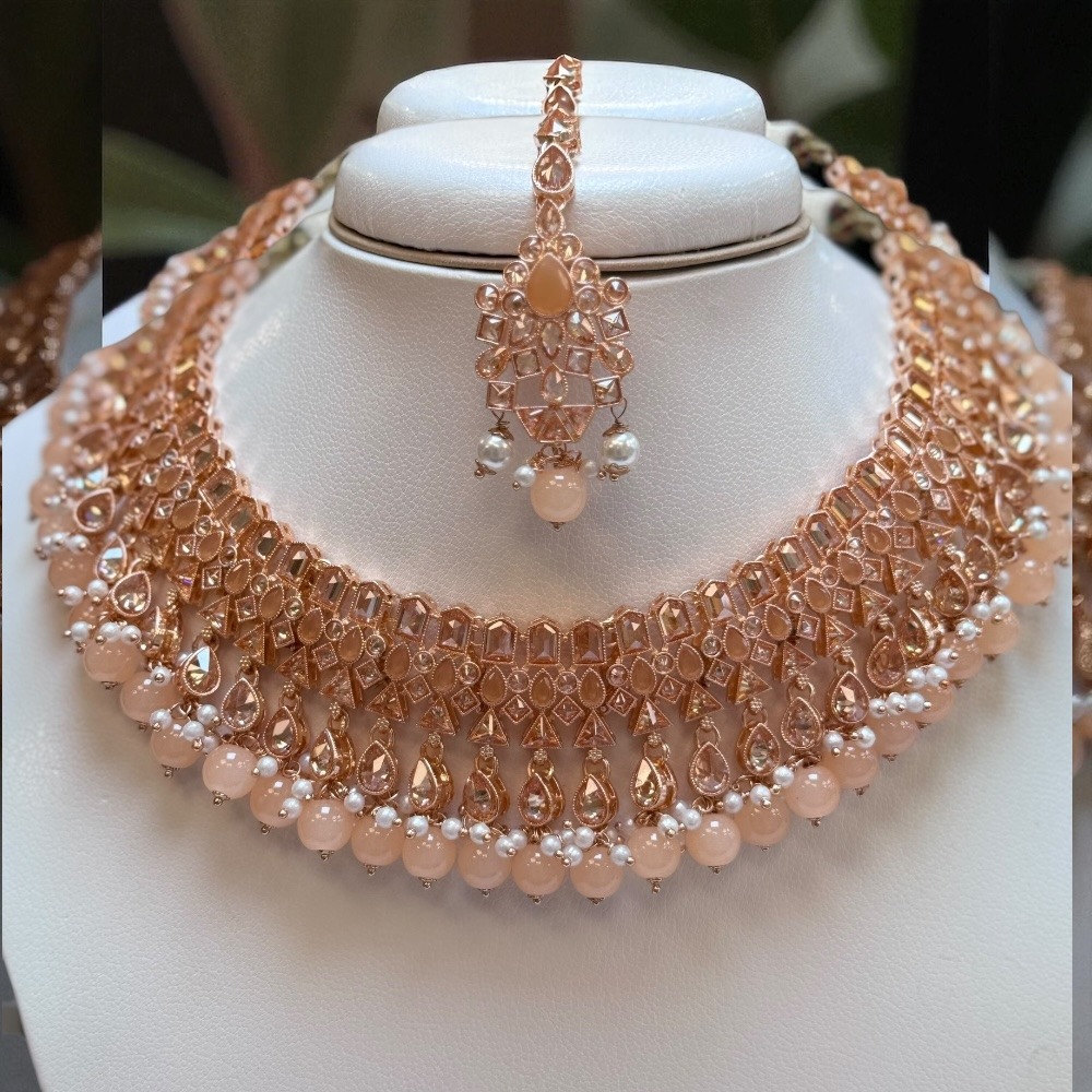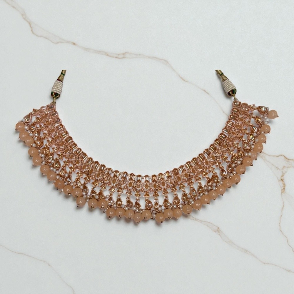 Crafted with attention to detail, this rose-colored set is perfect for luxury jewelry lovers who want an ethnic, bridal, and party-ready look. Add this stunning set to your collection and make every occasion special.