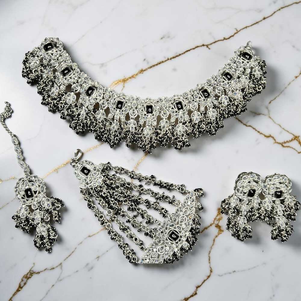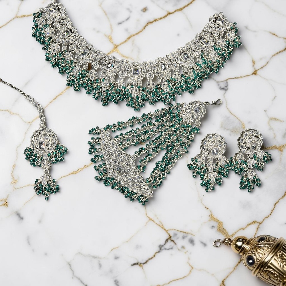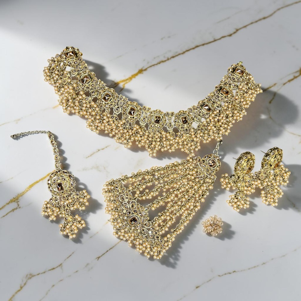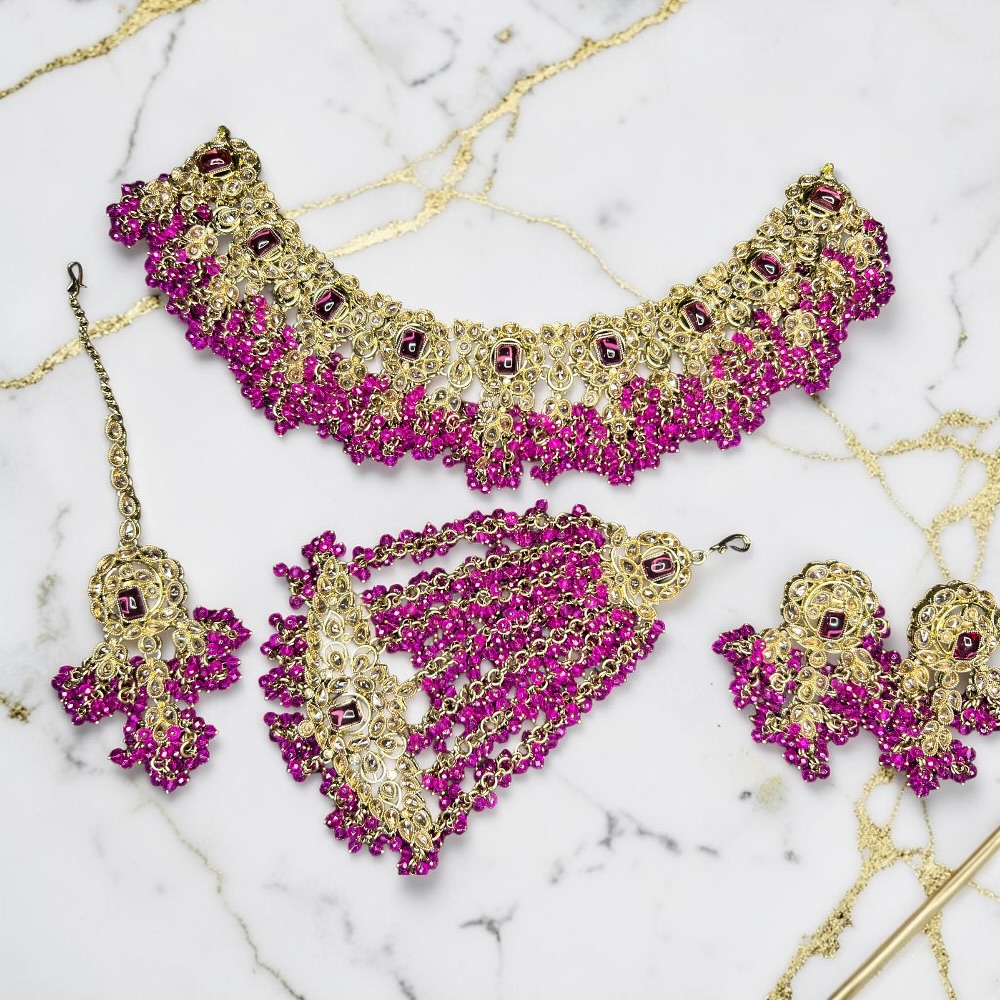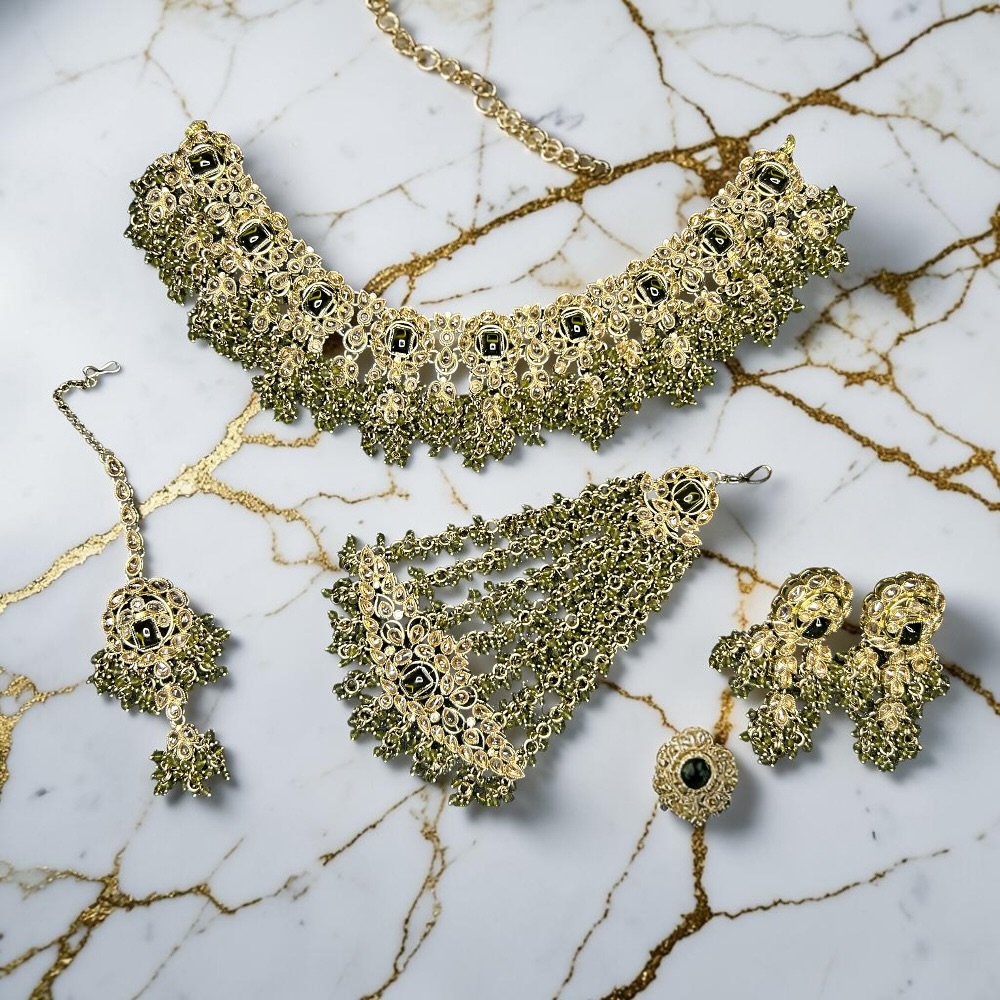 Complete bridal jewelry set including necklace, earrings, tikka, and jhumar (pasa). Designed in traditional Pakistani and Indian style, perfect for weddings, mehndi, and festive occasions. Lightweight, elegant, and ideal for a royal look.
