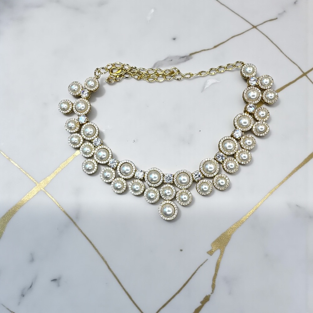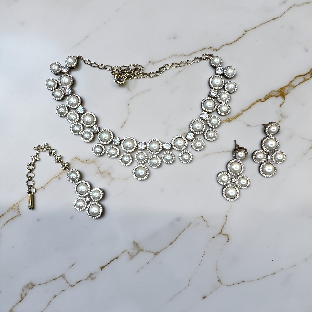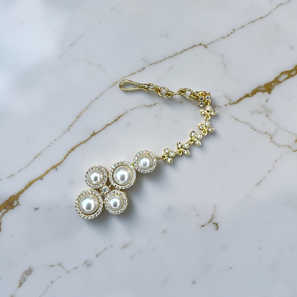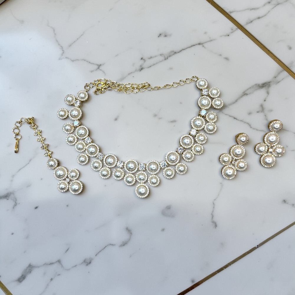 Beautiful pearl jewelry set including necklace, matching earrings, and tikka. Designed in traditional Indian and Pakistani style, perfect for weddings, mehndi, walima, Eid, and party wear. Lightweight, elegant, and comfortable to wear — ideal for brides and special occasions.