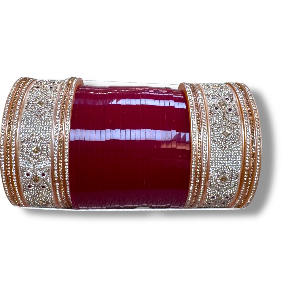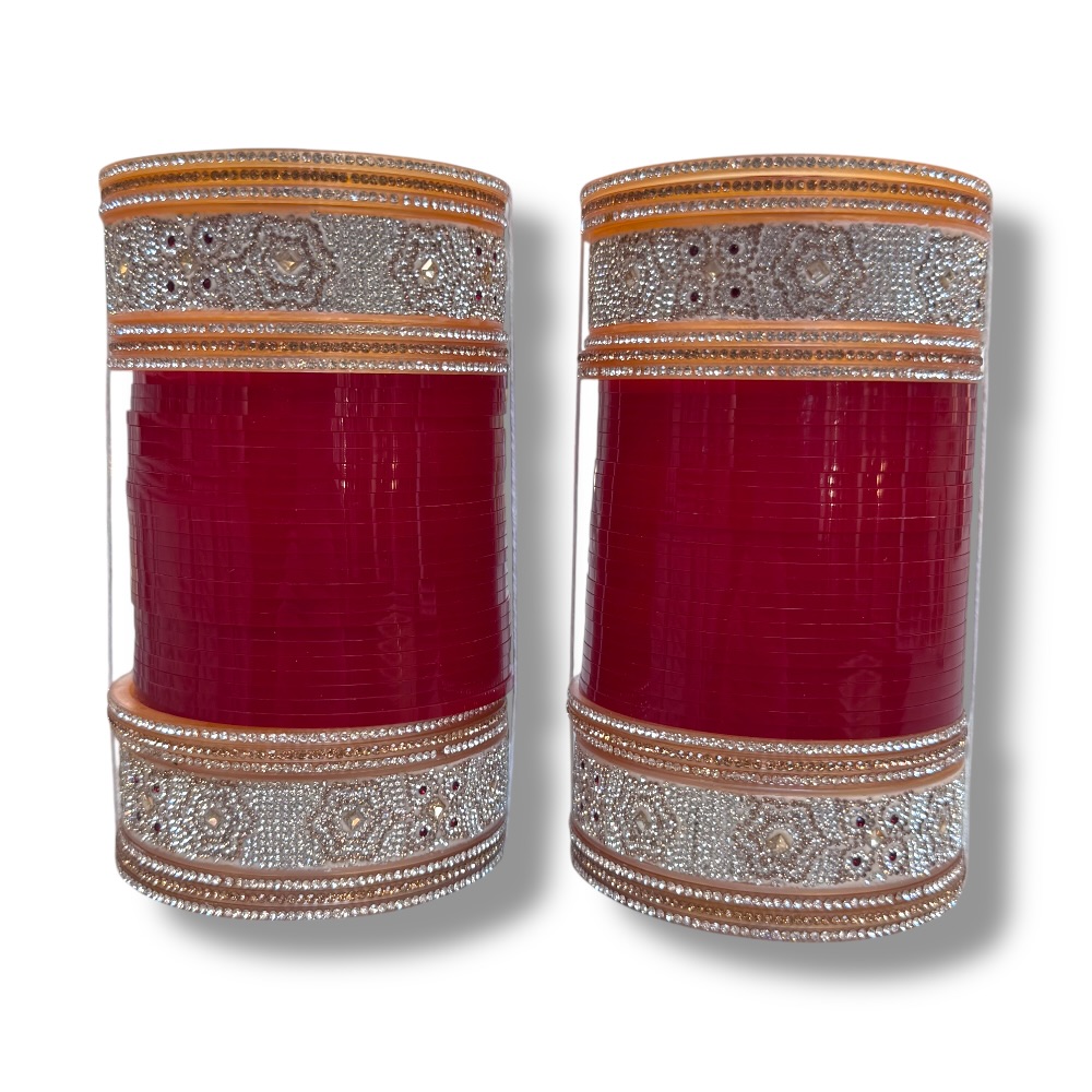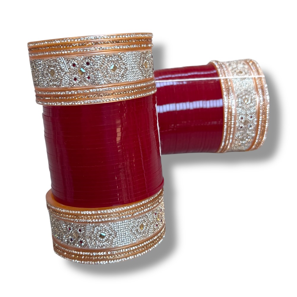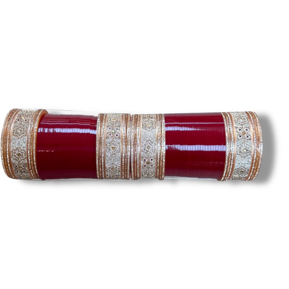 Celebrate your big day with this stunning Punjabi Wedding Bangles Choora Chura, designed in a rich blood red tone paired with elegant ivory look bangles. A timeless symbol of marriage and suhaag, this bridal set completes your traditional wedding look beautifully.