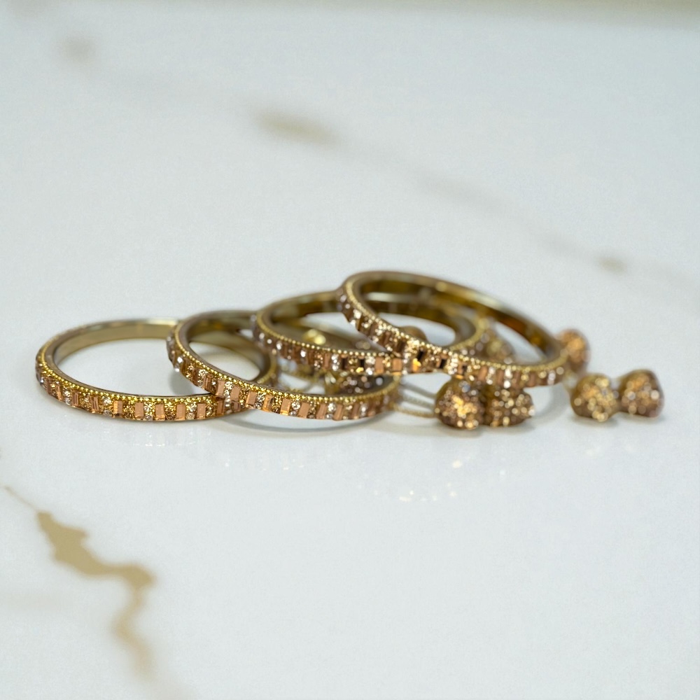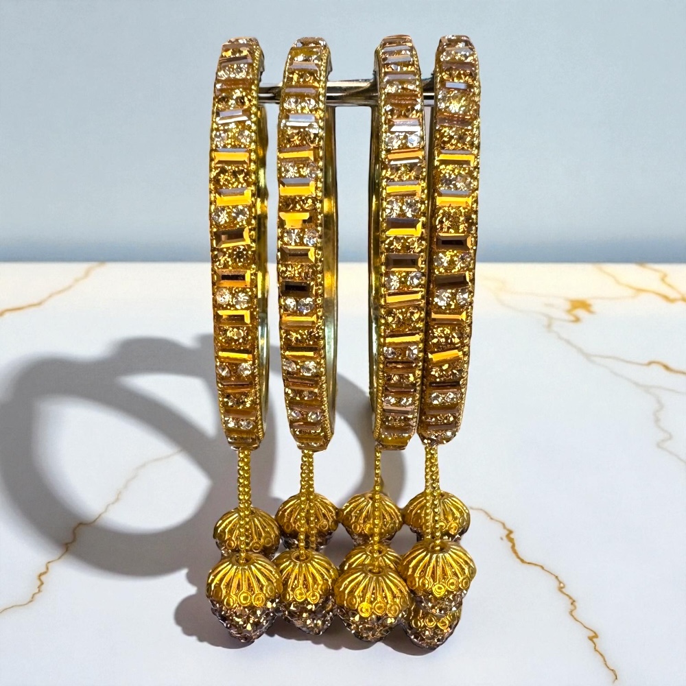 Add timeless elegance to your jewelry collection with this set of 4 dangly droplet churi bangles. Crafted with care and precision, these bangles feature a graceful droplet design that creates a subtle jingling sound with every movement — capturing the essence of traditional Indian beauty.