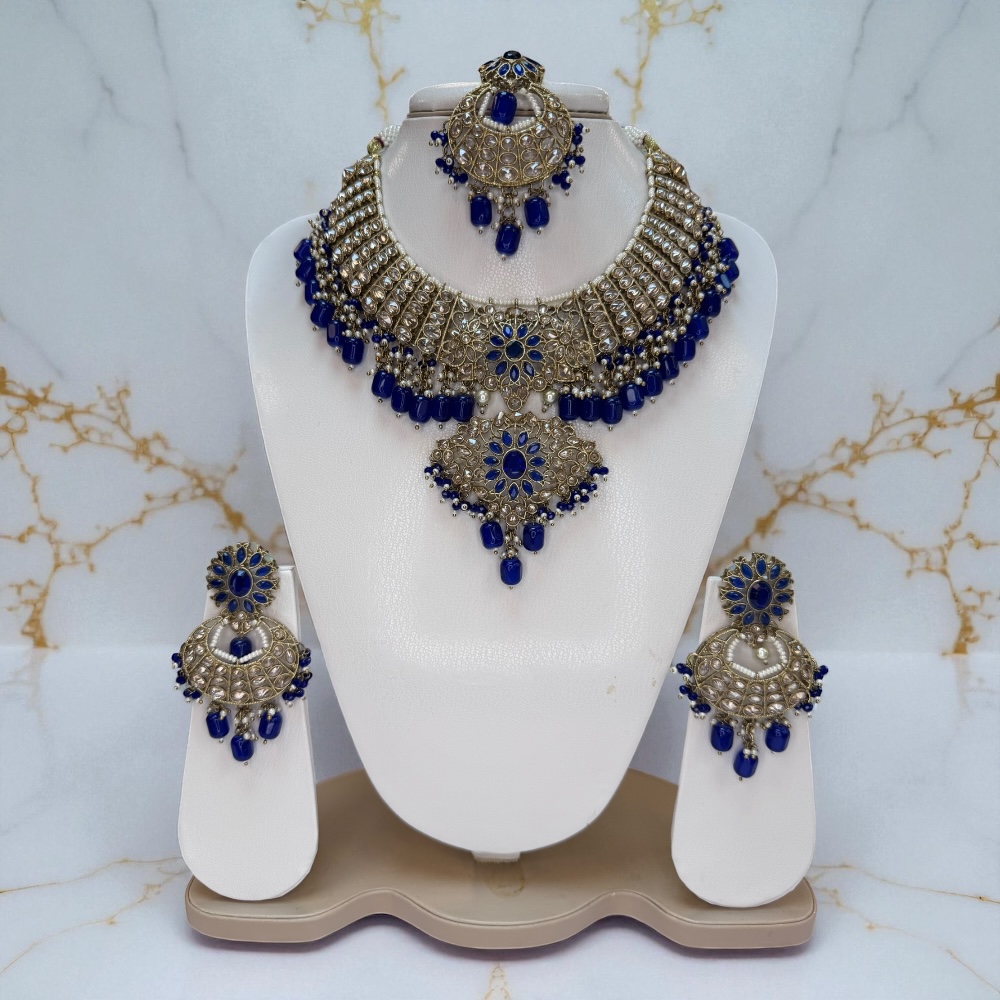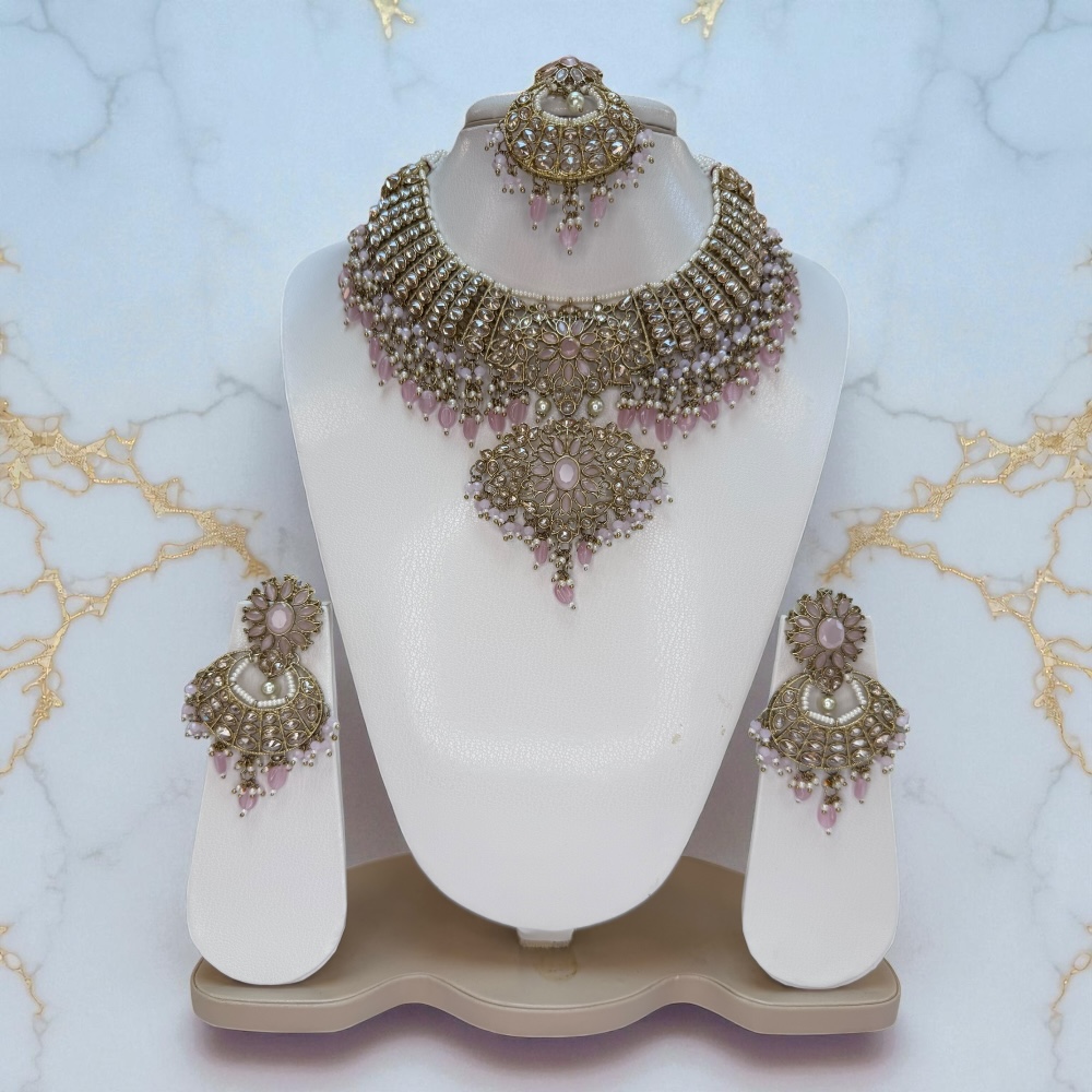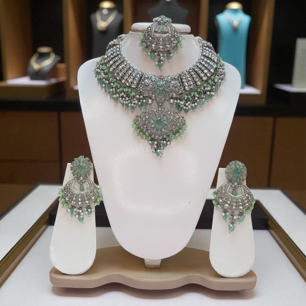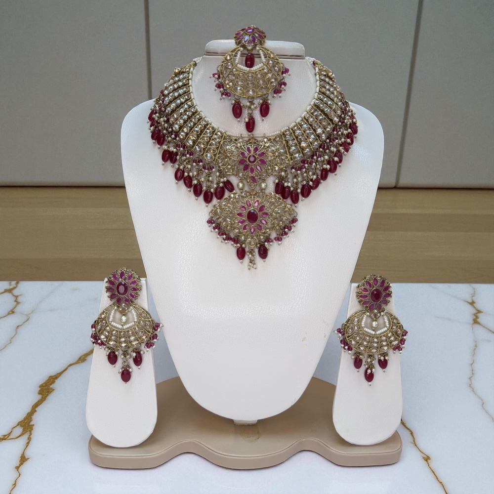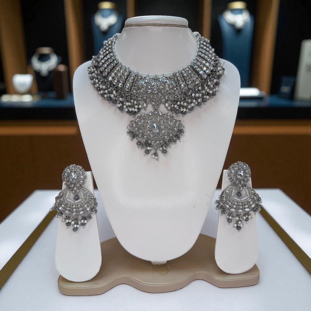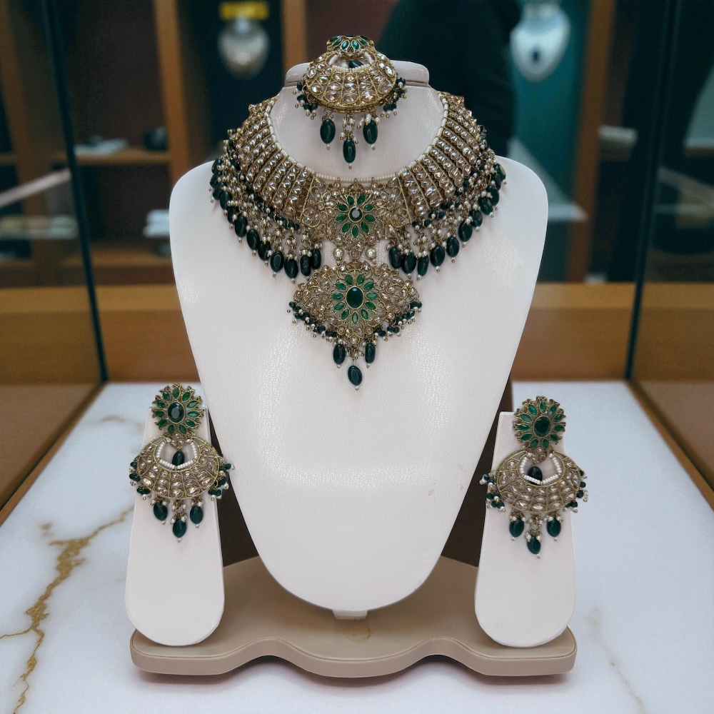 Complete jewellery set includes necklace, earrings, and tikka