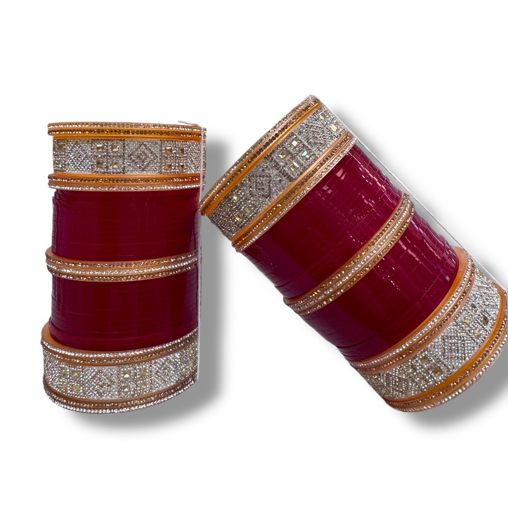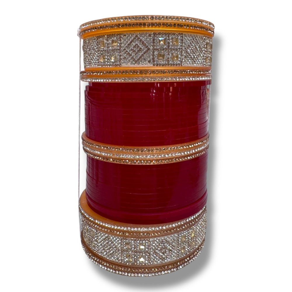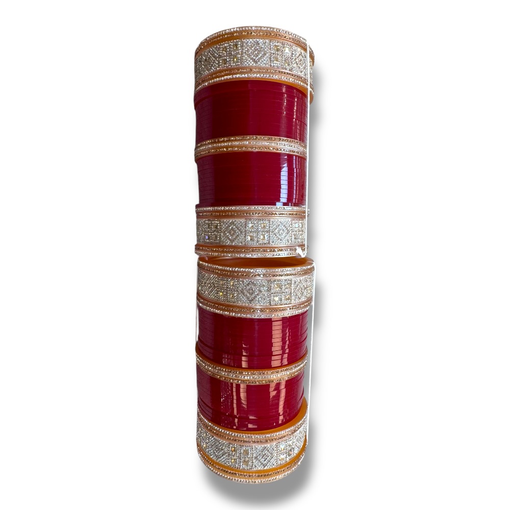 Traditional Suhaag Chura set for 2 hands in rich blood red color with elegant ivory look bangles. Includes 20 centre red bangles per arm. Made from high-quality resin (not plastic). Perfect for Punjabi, Sikh, Indian & Pakistani wedding ceremonies, mehndi, and shaadi functions.